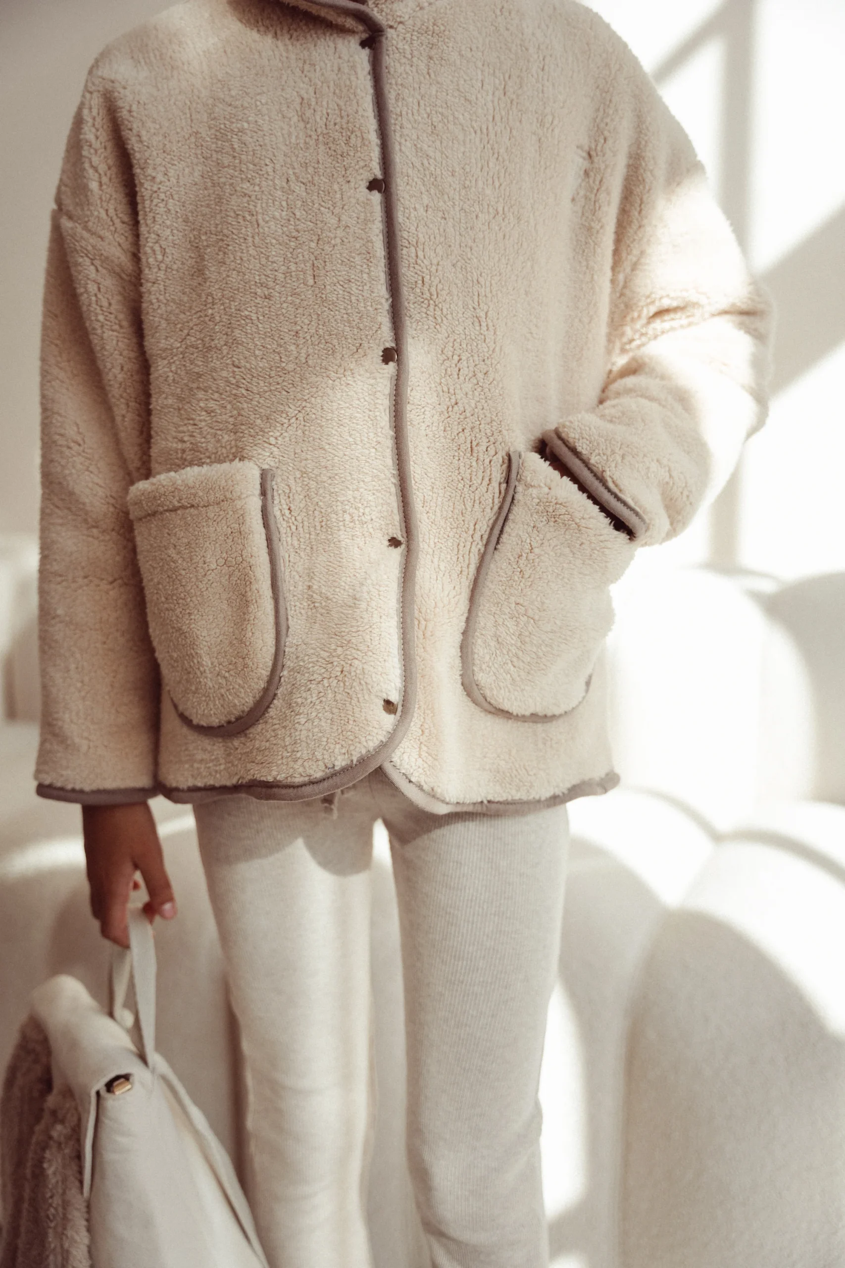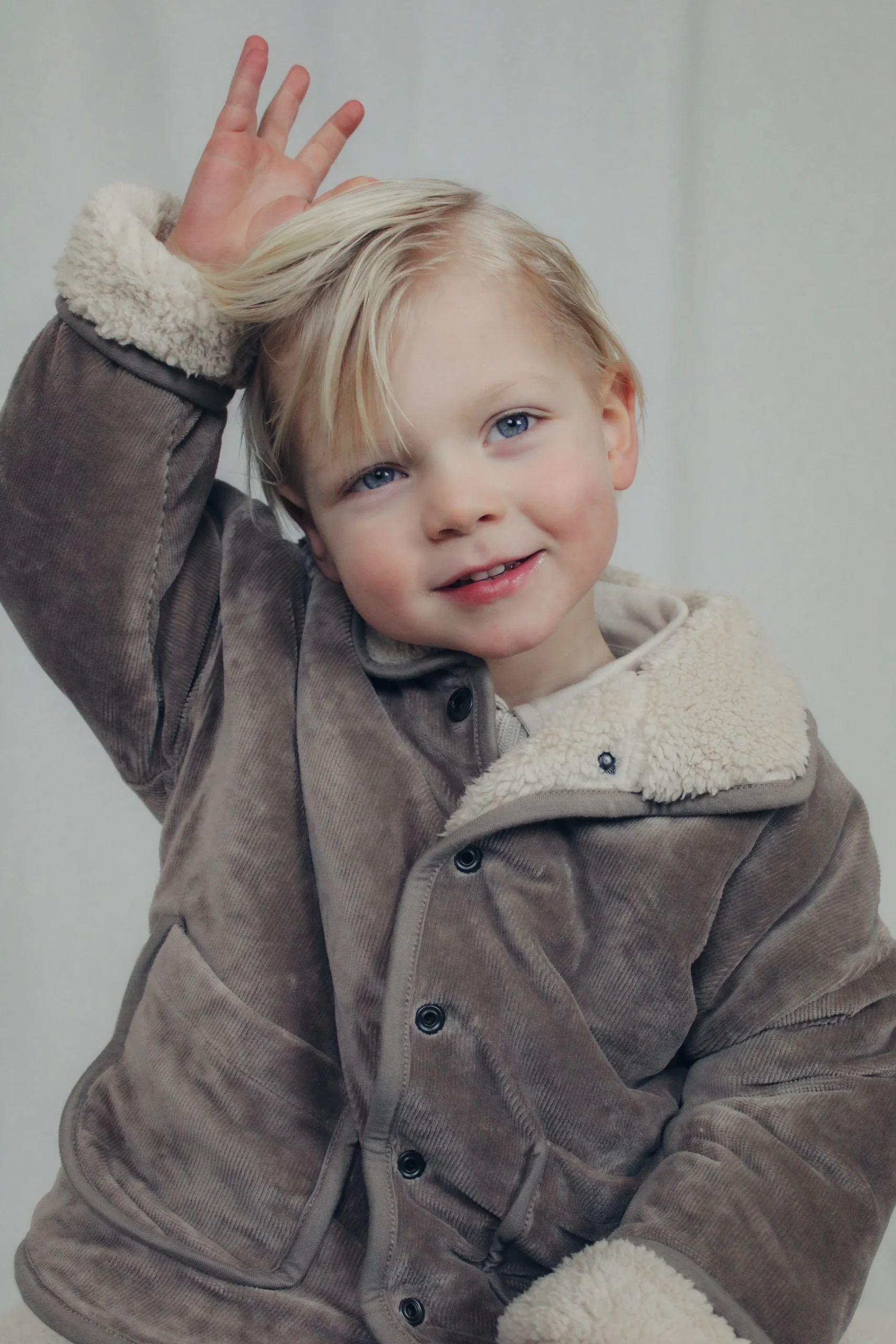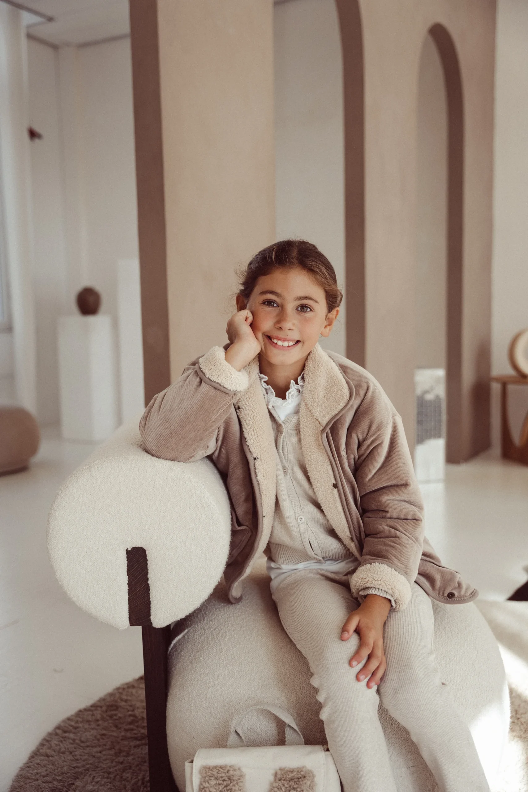 Deze jas is reversible. De ene kant is velvet taupe en de andere kant is teddy crème.