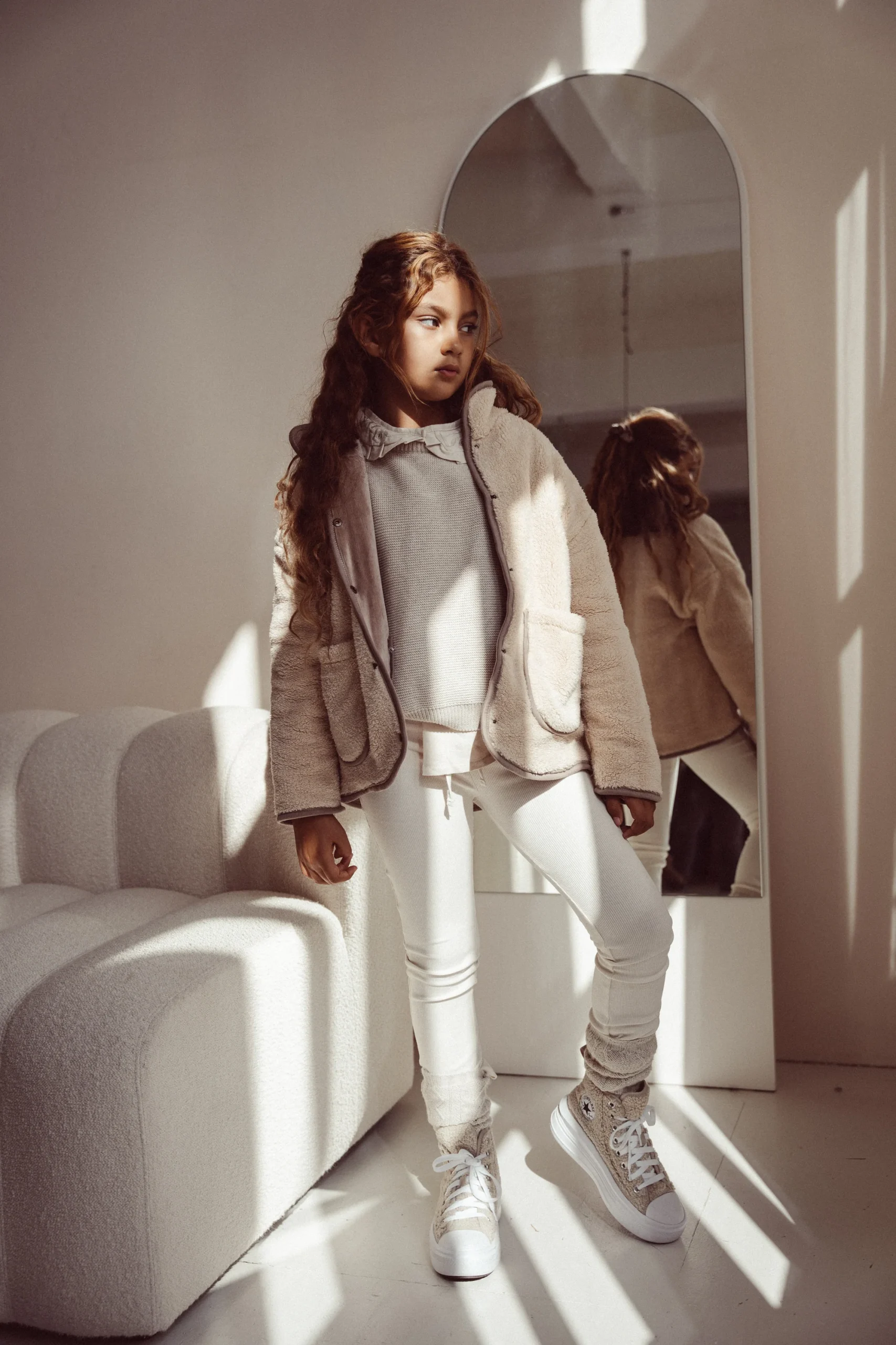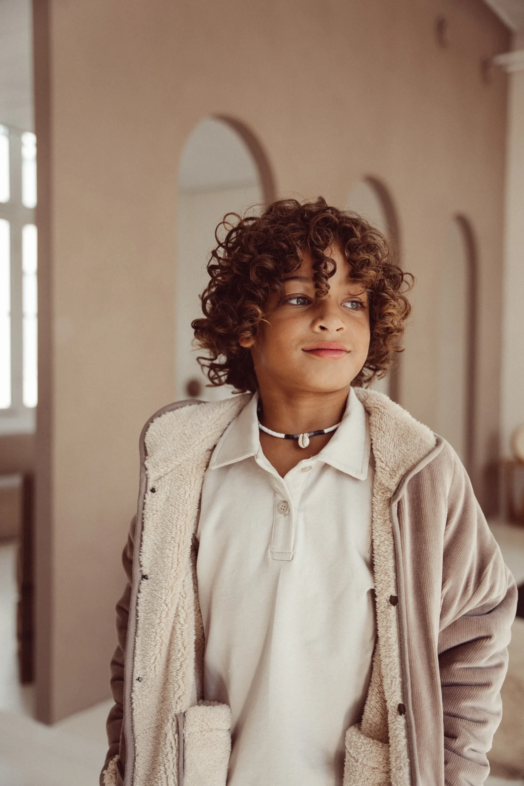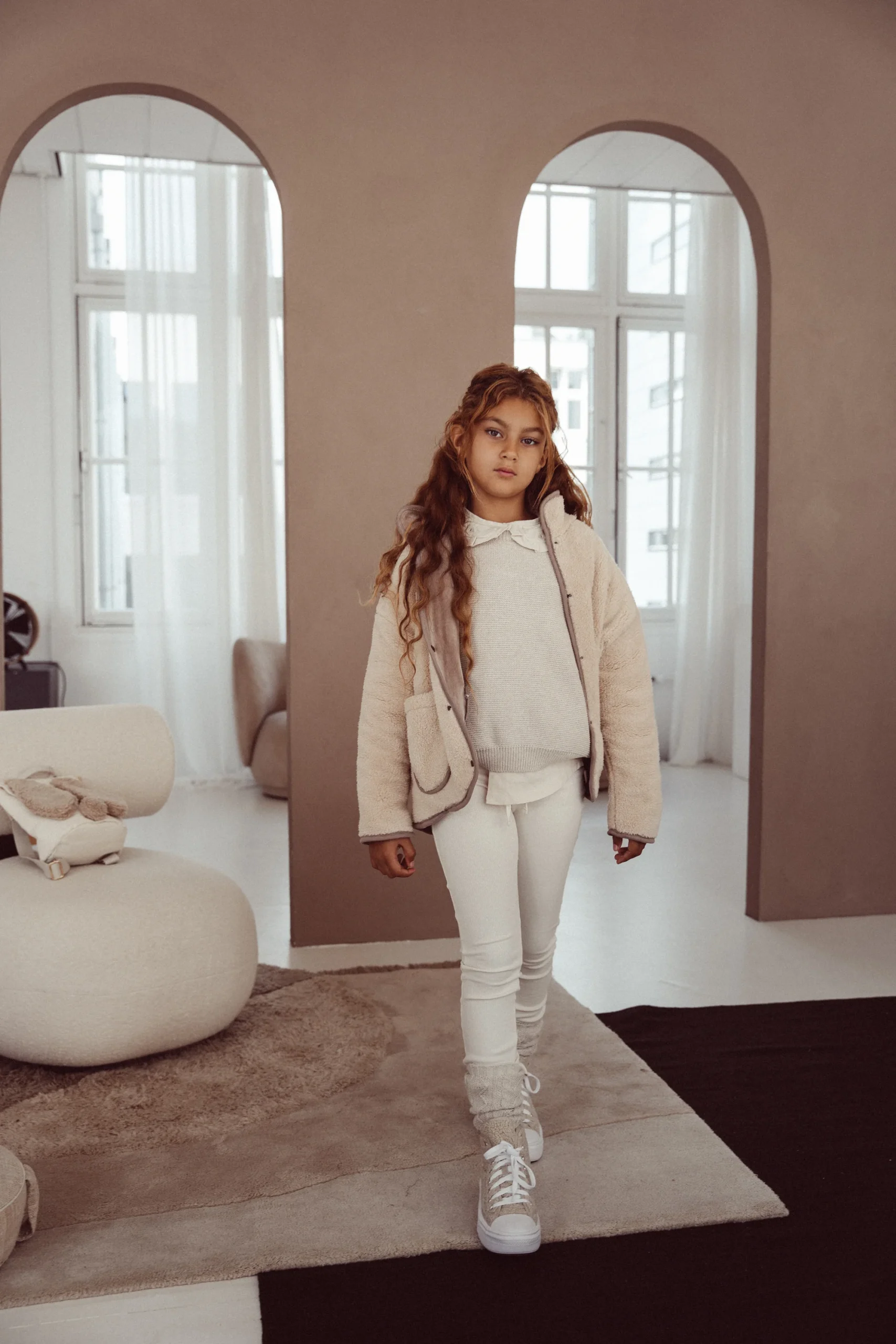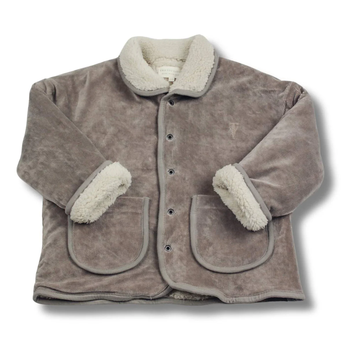 Deze jas is reversible. De ene kant is velvet taupe en de andere kant is teddy crème.