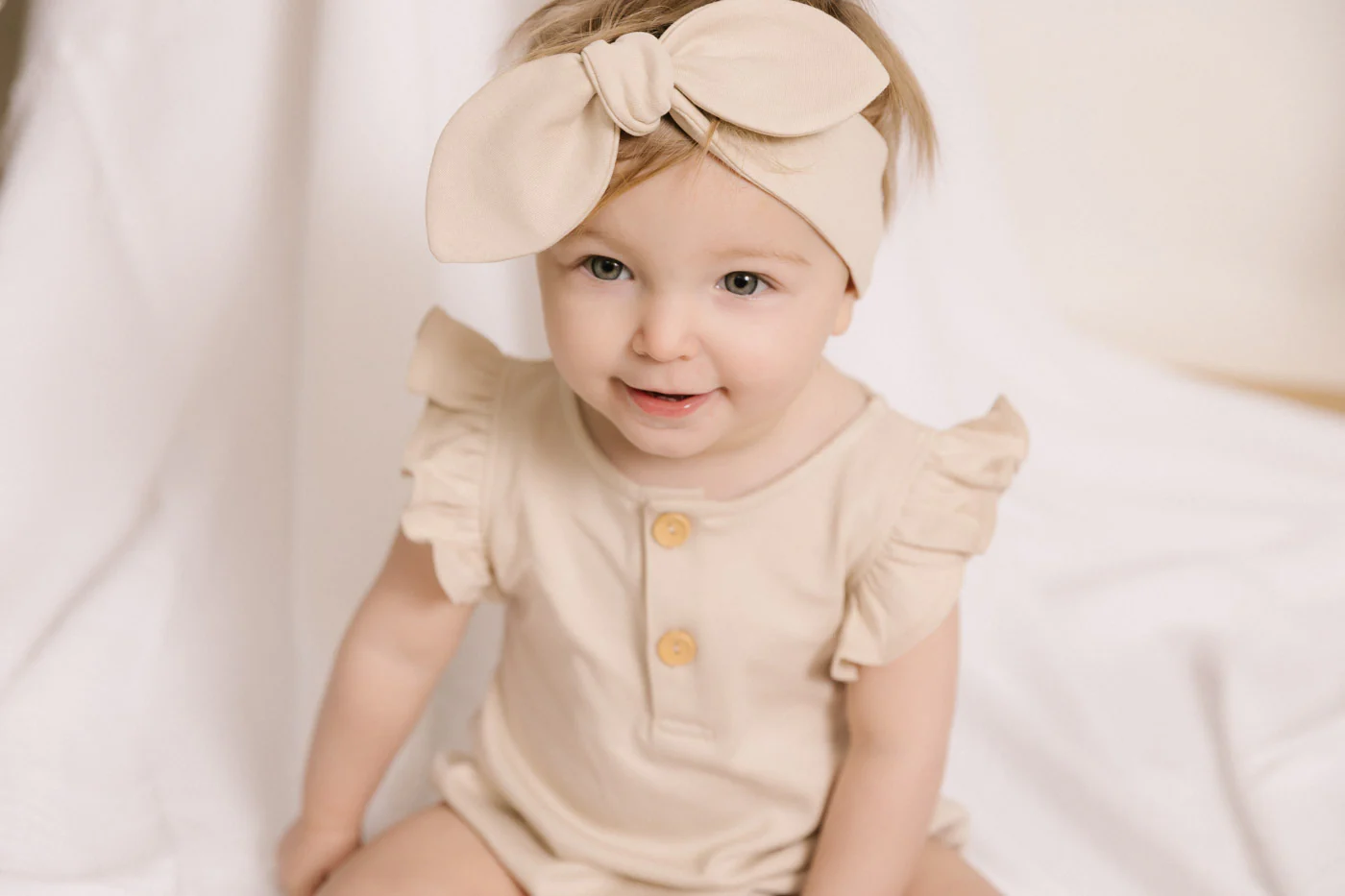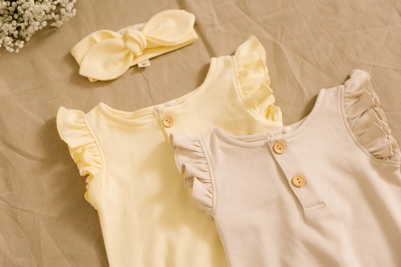 Dit schattige rompertje is ontworpen met ruches op de schouder en houten knopen op de borst. De romper heeft drukknopen aan de onderkant voor gemakkelijk aankleden en het verschonen van luiers. De elastische beengaten creëren een schattige bubble model. Een must have in de zomer garderobe van je kleine meisje.