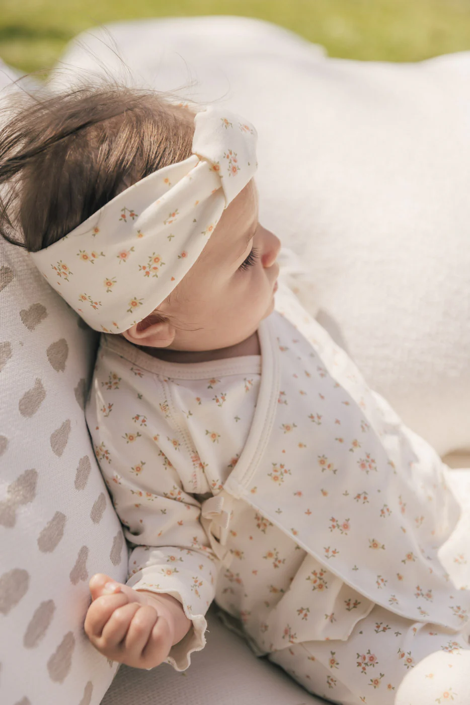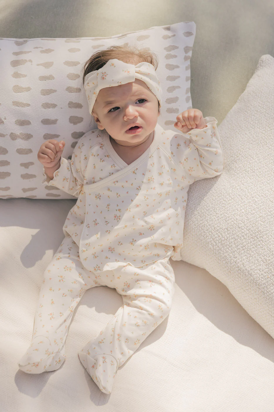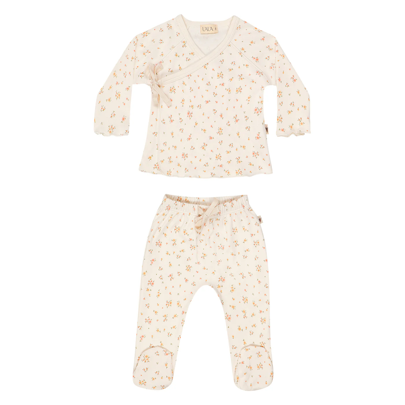 Schattig baby setje van UAUA collections. Newborn set florenza bestat uit een overslagvestje met striksluiting en broekje met vastzittende sokjes. De print florenza heeft een lief bloemetjes patroon op een crèmekleurige onderkleur. Dit newborn pakje is gemaakt van super zacht pima katoen. Heel geschikt als eerste outfit.