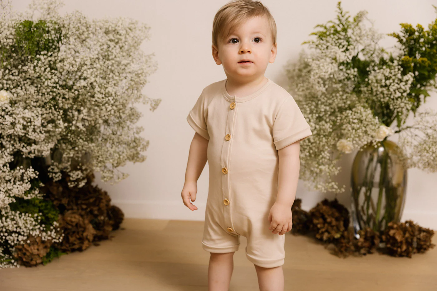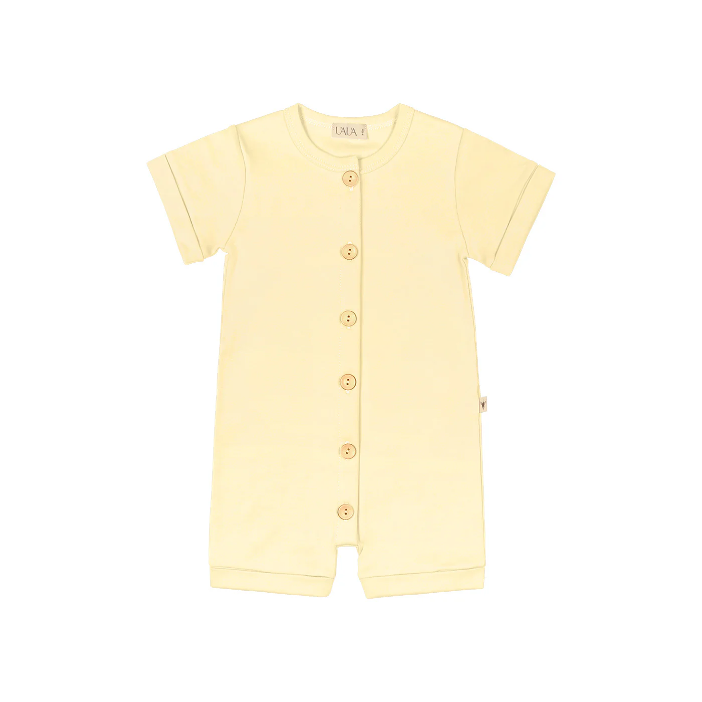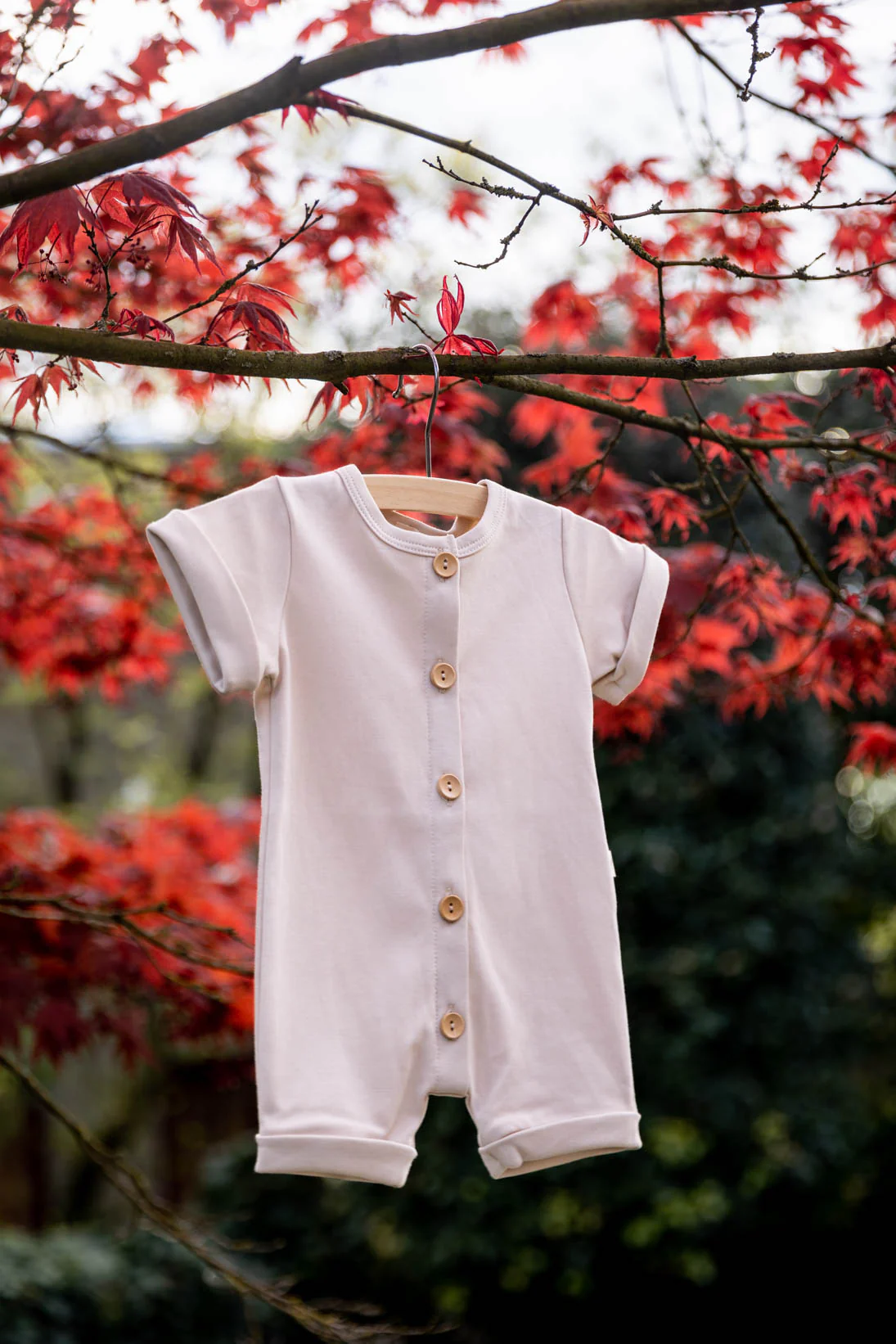De onesie heeft houten knopen op de borst heeft opgerolde mouwen en broekspijpen die net boven de knie vallen. Het is een klassiek en speels ontwerp, perfect voor zomerse dagen.
