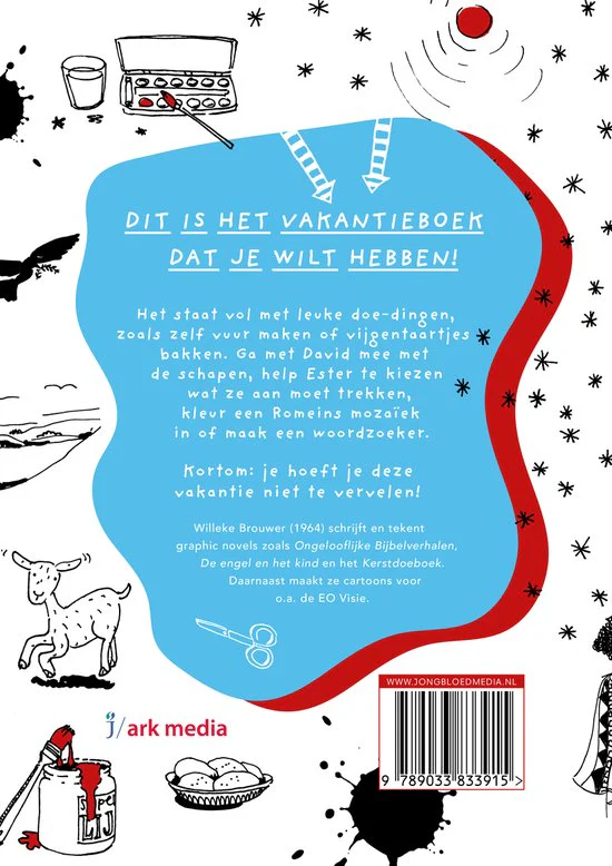 Dit is het vakantieboek dat je wilt hebben! Het staat vol met leuke doe-dingen, zoals zelf vuur maken of vijgentaartjes bakken. Ga met David mee met de schapen, help Ester te kiezen wat ze aan moet trekken, kleur een Romeins mozaïek in of maak een woordzoeker. Als je geen zin hebt om iets te doen, kun je ook lekker de verhalen lezen. Deze vakantie zal jij je niet vervelen met dit boek! • Doeboek met leuke opdrachten voor denkers en doeners • Bedacht en geïllustreerd door Willeke Brouwer • Ook een mooi cadeau voor kerken en scholen • Voor kinderen vanaf 9 jaar Willeke Brouwer (1964) schrijft en tekent graphic novels, zoals Ongelooflijke bijbelverhalen, Het ongelooflijke verhaal van het kerstkind en het Kerstdoeboek. Daarnaast maakt ze cartoons voor o.a. de EO Visie.
