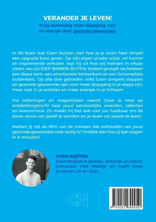 VERANDER JE LEVEN! Krijg eenvoudig meer diepgang, rust en energie door gezonde gewoontes. In dit boek laat Coen Nuijten zien hoe je je leven heel simpel een upgrade kunt geven. Op zijn eigen unieke wijze, vol humor en inspirerende verhalen, legt hij uit hoe wij mensen in elkaar zitten: we zijn DIEP-BINNEN-BUITEN. Anders gezegd: we hebben een diepe kant, een emotionele binnenkant en een lichamelijke buitenkant. Op alle drie gebieden reikt Coen simpele stappen en gezonde gewoontes aan voor meer diepgang in je diepe zijn, meer rust in je emoties en meer energie in je lichaam. Via oefeningen en vragenlijsten neemt Coen je mee op ontdekkingstocht naar jouw persoonlijke waarden, talenten en levensmissie. Zo maakt hij het ook voor jou haalbaar om de beste versie van jezelf te worden en je leven vol passie te leven. Herken jij net als 95% van de mensen dat volhouden van jouw gezonde gewoontes vaak lastig is? Ontdek dan hoe jij kan slagen in 9 minuten!