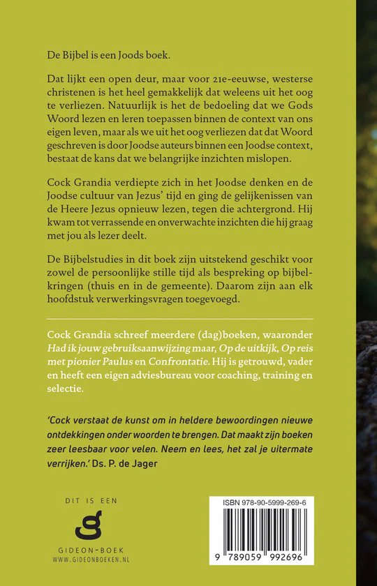 De Bijbel is een Joods boek. Dat lijkt een open deur, maar voor 21e-eeuwse, westerse christenen is het heel gemakkelijk dat weleens uit het oog te verliezen. Natuurlijk is het de bedoeling dat we Gods Woord lezen en leren toepassen binnen de context van ons eigen leven, maar als we uit het oog verliezen dat dat Woord geschreven is door Joodse auteurs binnen een Joodse context, bestaat de kans dat we belangrijke inzichten mislopen. Cock Grandia verdiepte zich in het Joodse denken en de Joodse cultuur van Jezus’ tijd en ging de gelijkenissen van de Heere Jezus opnieuw lezen, tegen die achtergrond. Hij kwam tot verrassende en onverwachte inzichten die hij graag met jou als lezer deelt. De Bijbelstudies in dit boek zijn uitstekend geschikt voor zowel de persoonlijke stille tijd als bespreking op Bijbelkringen (thuis en in de gemeente). Daarom zijn aan elk hoofdstuk verwerkingsvragen toegevoegd. ‘Cock verstaat de kunst om in heldere bewoordingen nieuwe ontdekkingen onder woorden te brengen. Dat maakt zijn boeken zeer leesbaar voor velen. Neem en lees, het zal je uitermate verrijken.’ Ds. P. de Jager