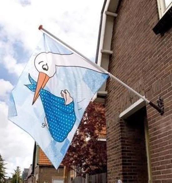 Gevelvlag (90 x 150cm) met de afbeelding van een ooievaar die een baby in een zakdoek vasthoudt