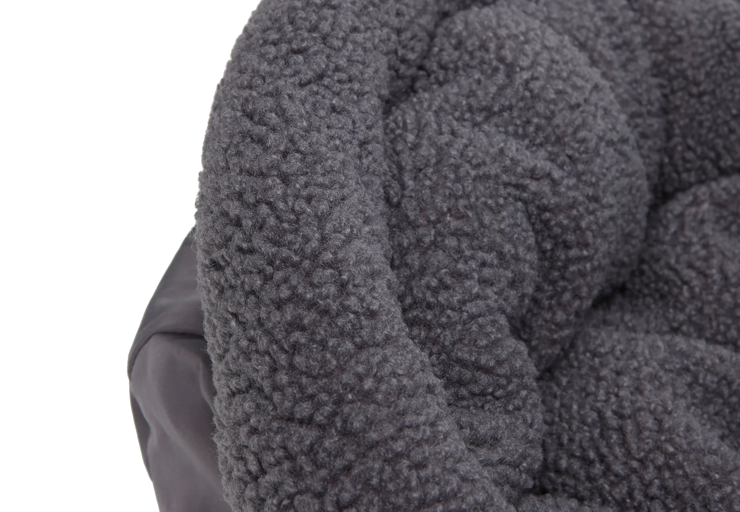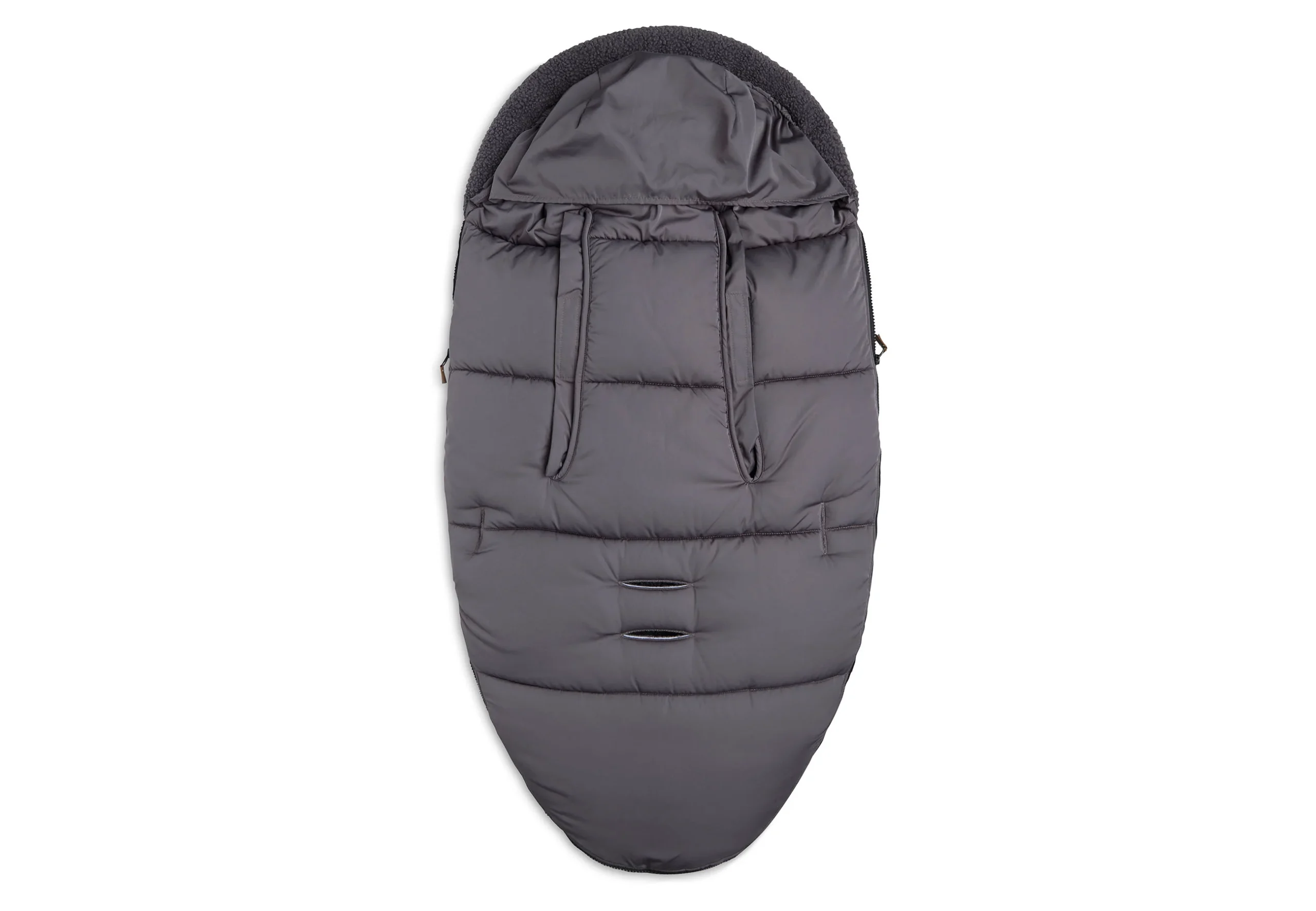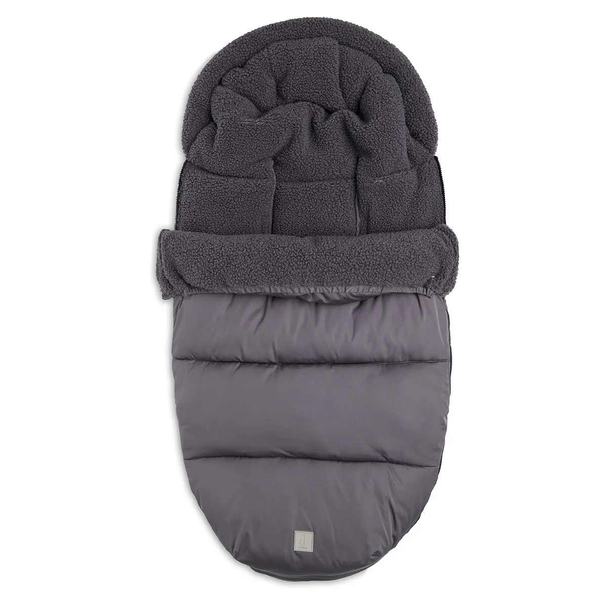 De kleur van de voetenzak is donkergrijs en vooral de teddy binnenkant neigt naar antraciet. Deze voetenzak is ook beschikbaar in de kleuren olijfgroen en biscuit (lichtbruin).