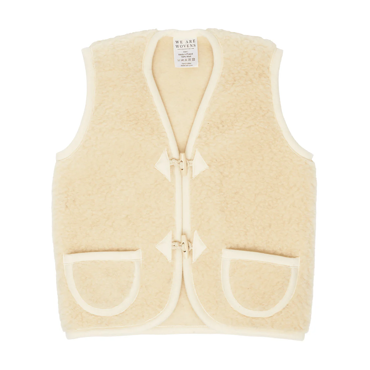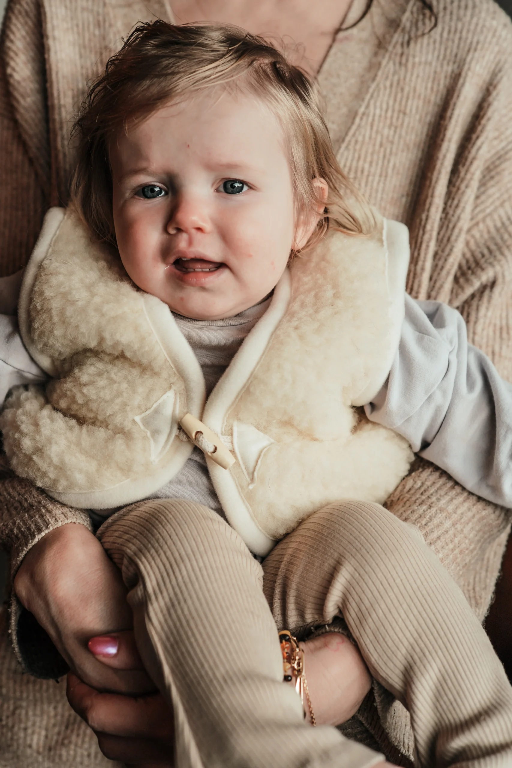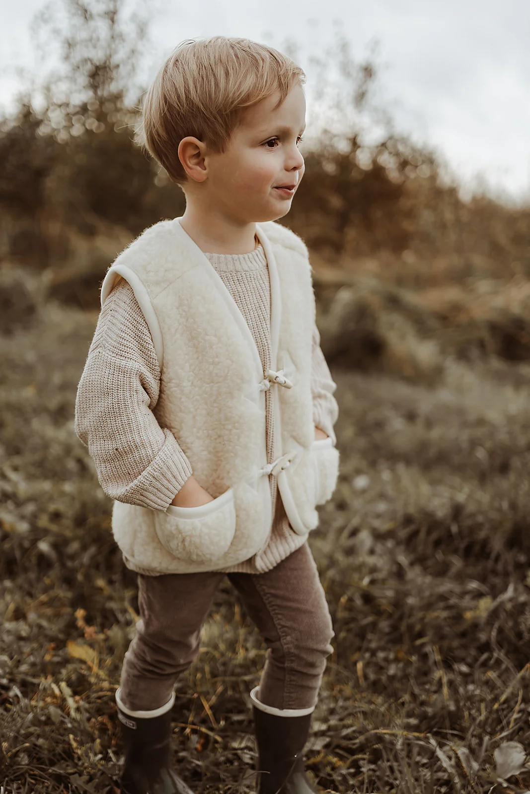 Een prachtig wollen gilet in de kleur offwhite/crème. Bodywarmer Flat White bestaat uit 100% zuivere merino wol. De bodywarmer is handgemaakt. De gebruikte wol komt bij kleine boerderijen vandaan waar de schapen vrij rond mogen lopen. Dit duurzame kledingstuk voor jouw kleintje past in elke garderobe, ongeacht kledingstijl en geslacht van je kindje.