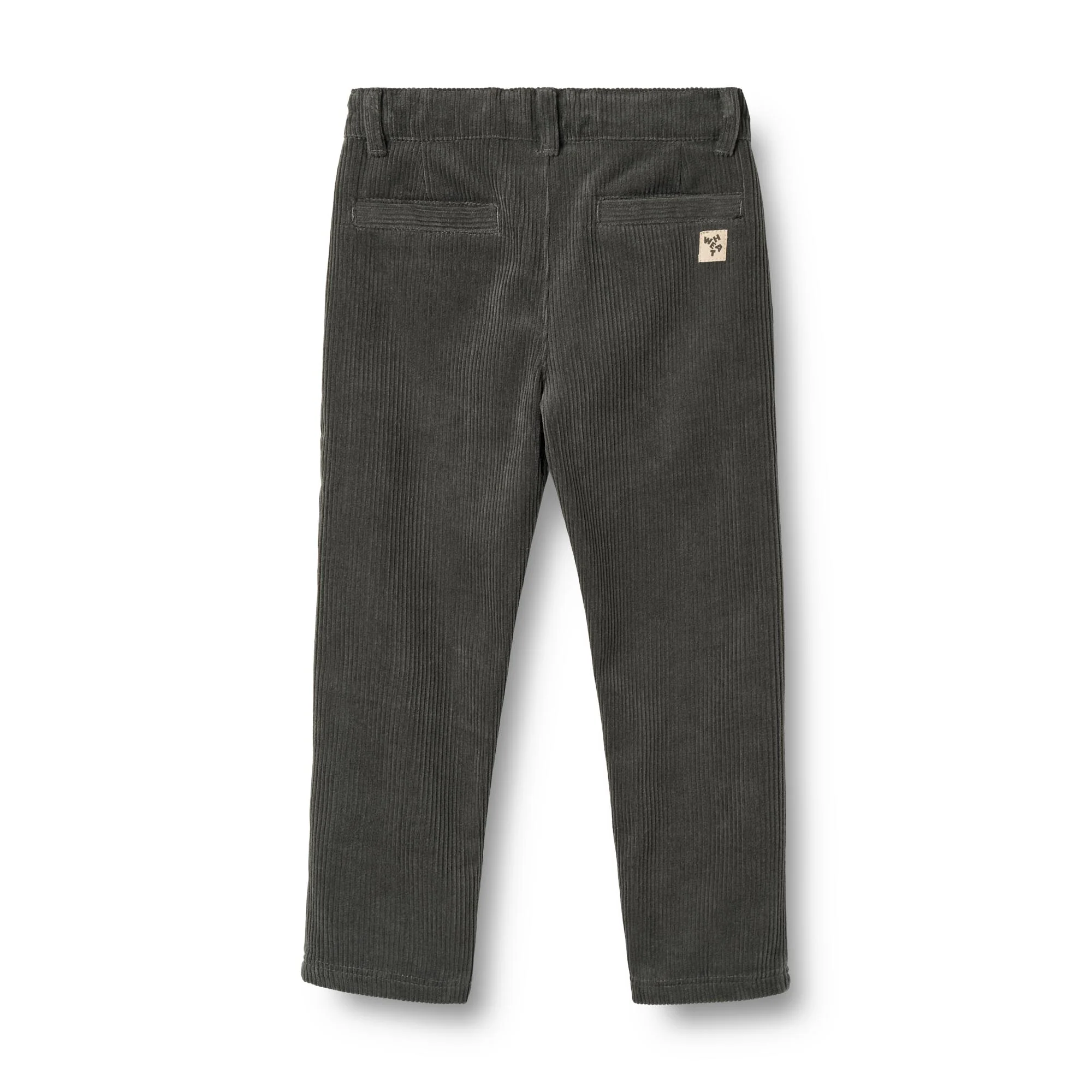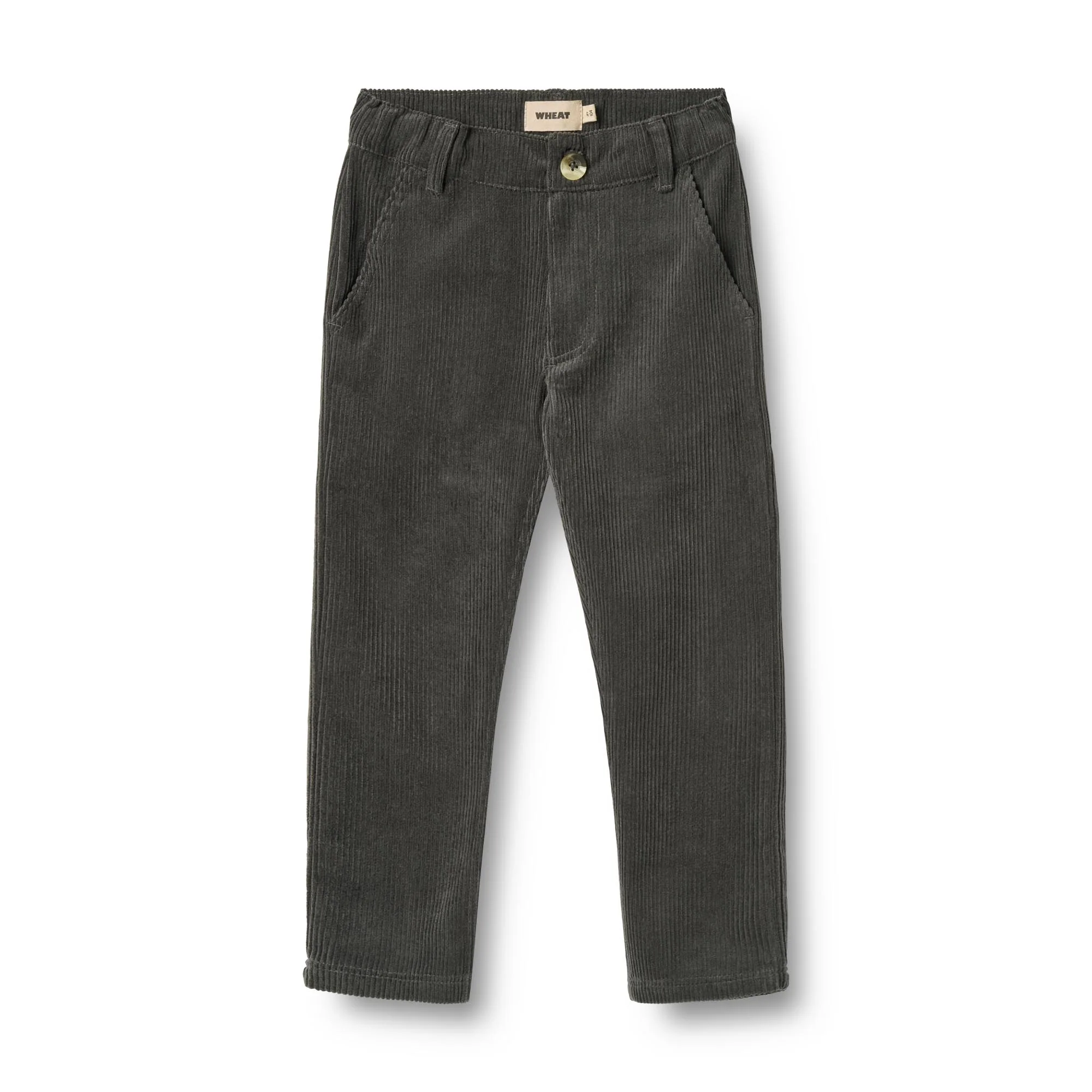 Stoere winterbroek van corduroy stof voor jongens. Broek Hugo van het Deense kinderkleding merk Wheat heeft een rechte pasvorm en normale pasvorm. De kleur black sea is een donker grijze tint. De broek heeft een groenige gloed.