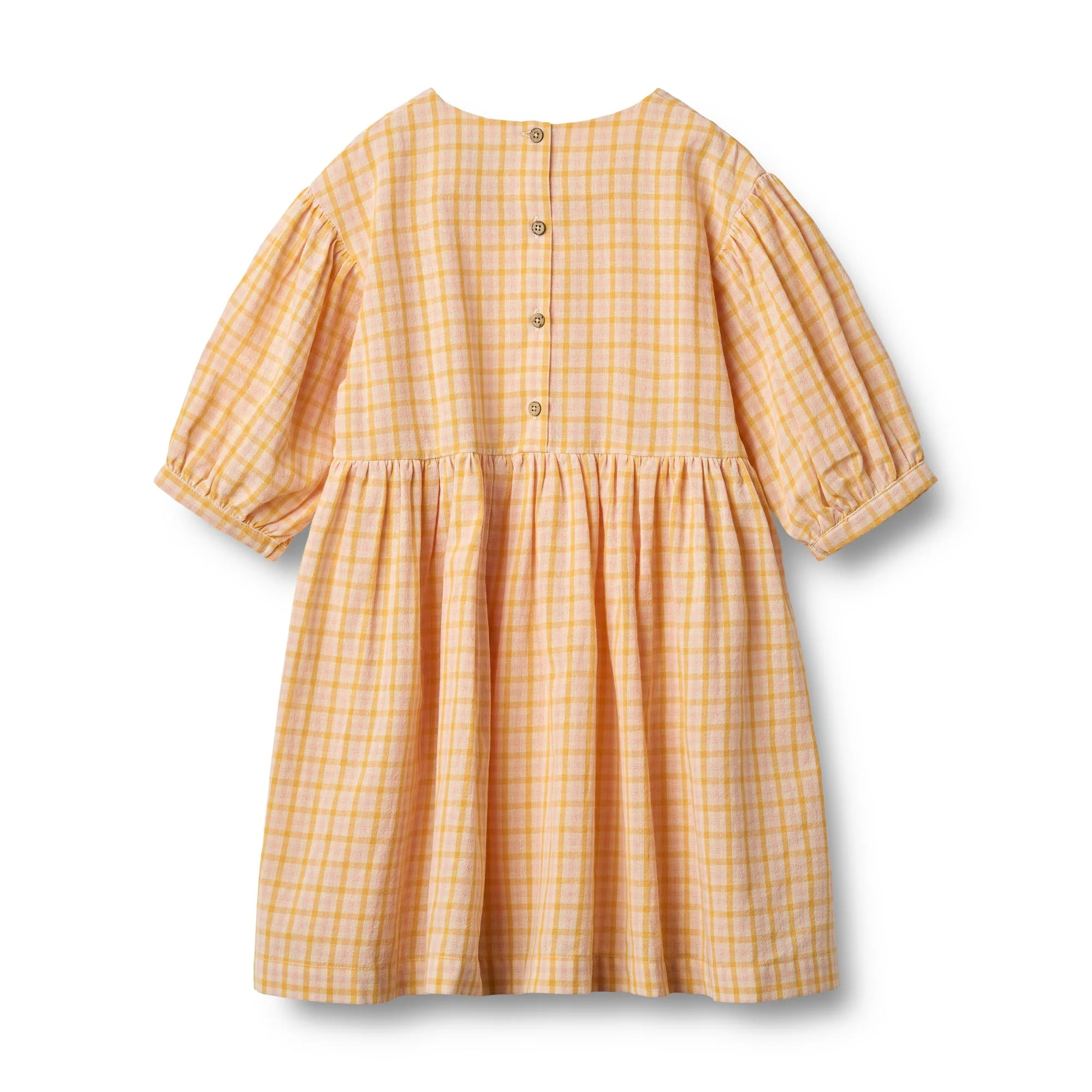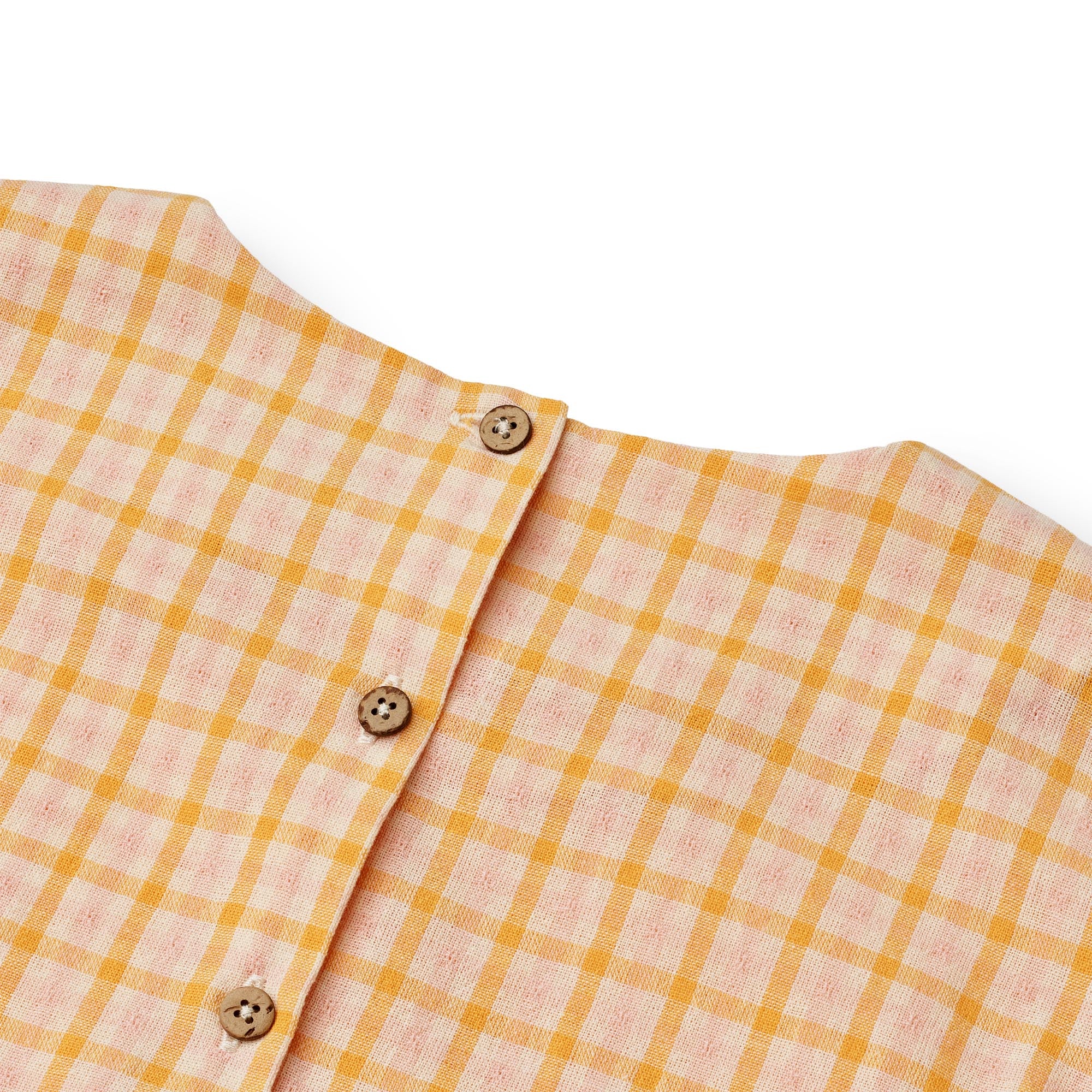 Heerlijk jurkje met zomerse ruit patroon. Yellow check heeft de tinten geel, oranje en roze wat zorgt voor een zoet printje.