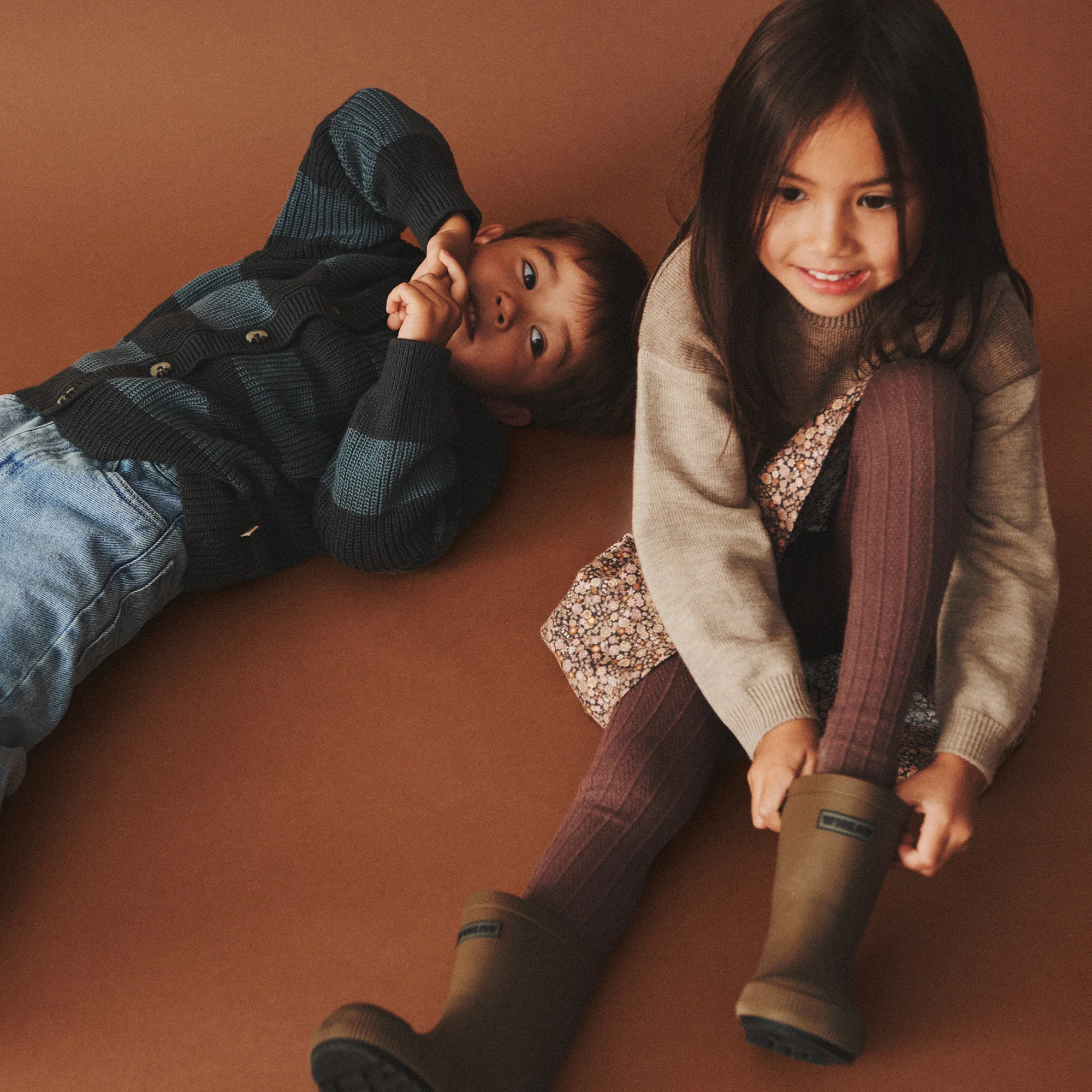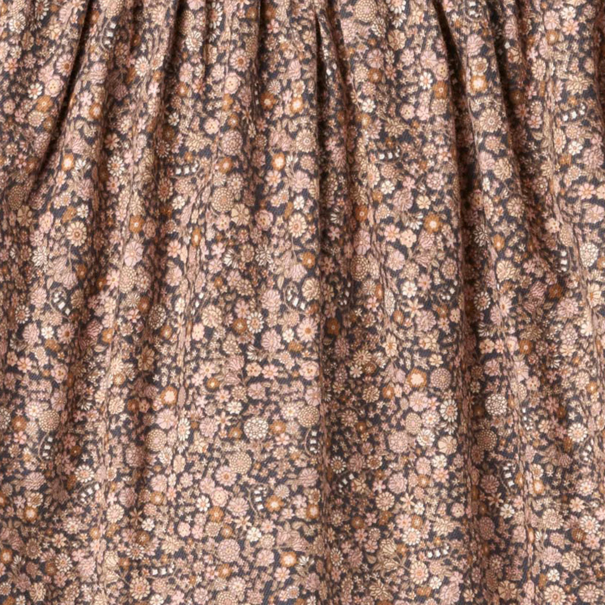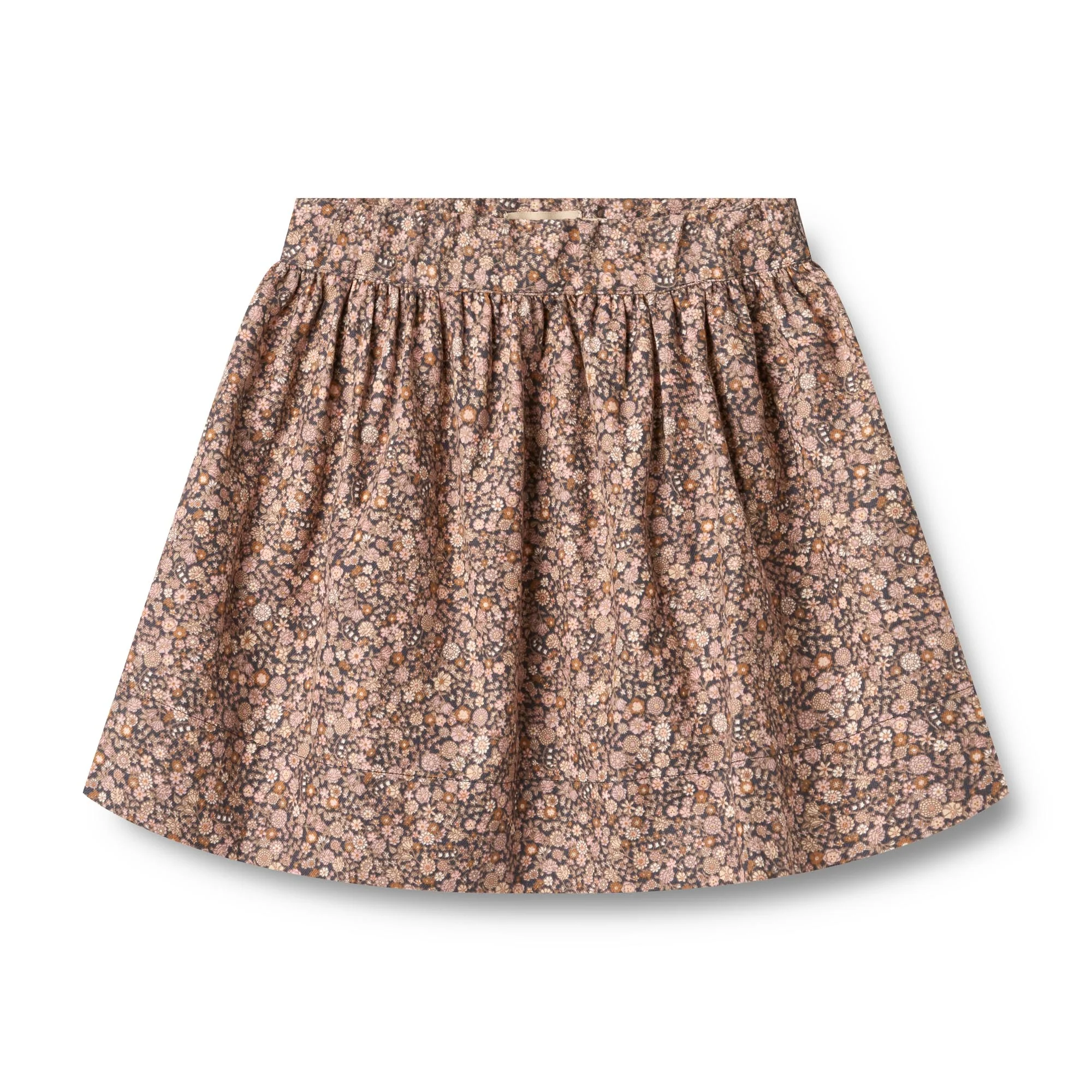 Gebloemd rokje van het Deense kinderkleding merk Wheat. Rok Sissi heeft een winters bloemen design: black sea garden. De hoofd kleuren zijn donkergrijs, lichtroze en oranje en beige.
