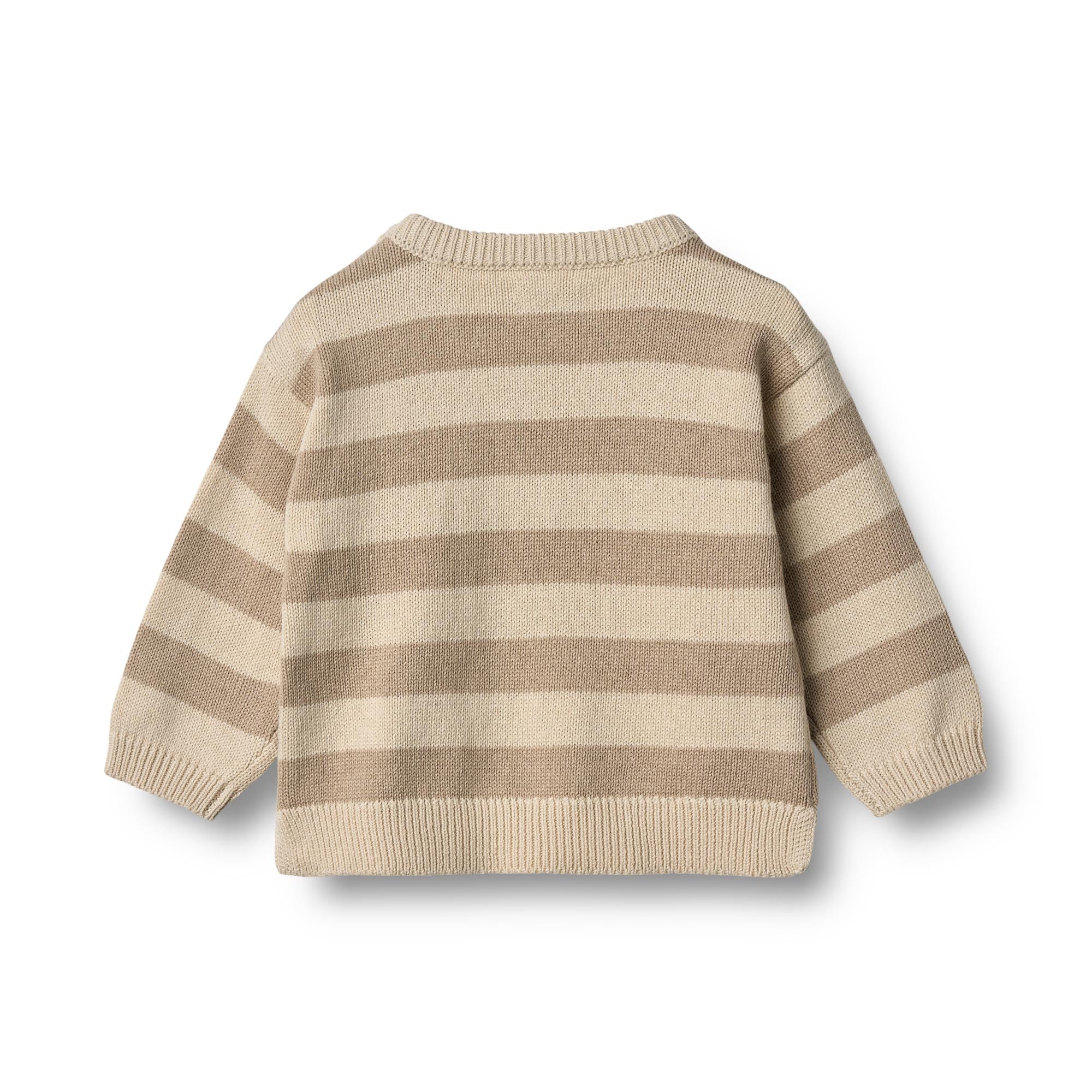 Gebreide trui met lange mouwen en strepen van zacht biologisch katoen voor baby’s. De trui heeft een streep patroon met afwisselend beige en crèmekleurige strepen.
