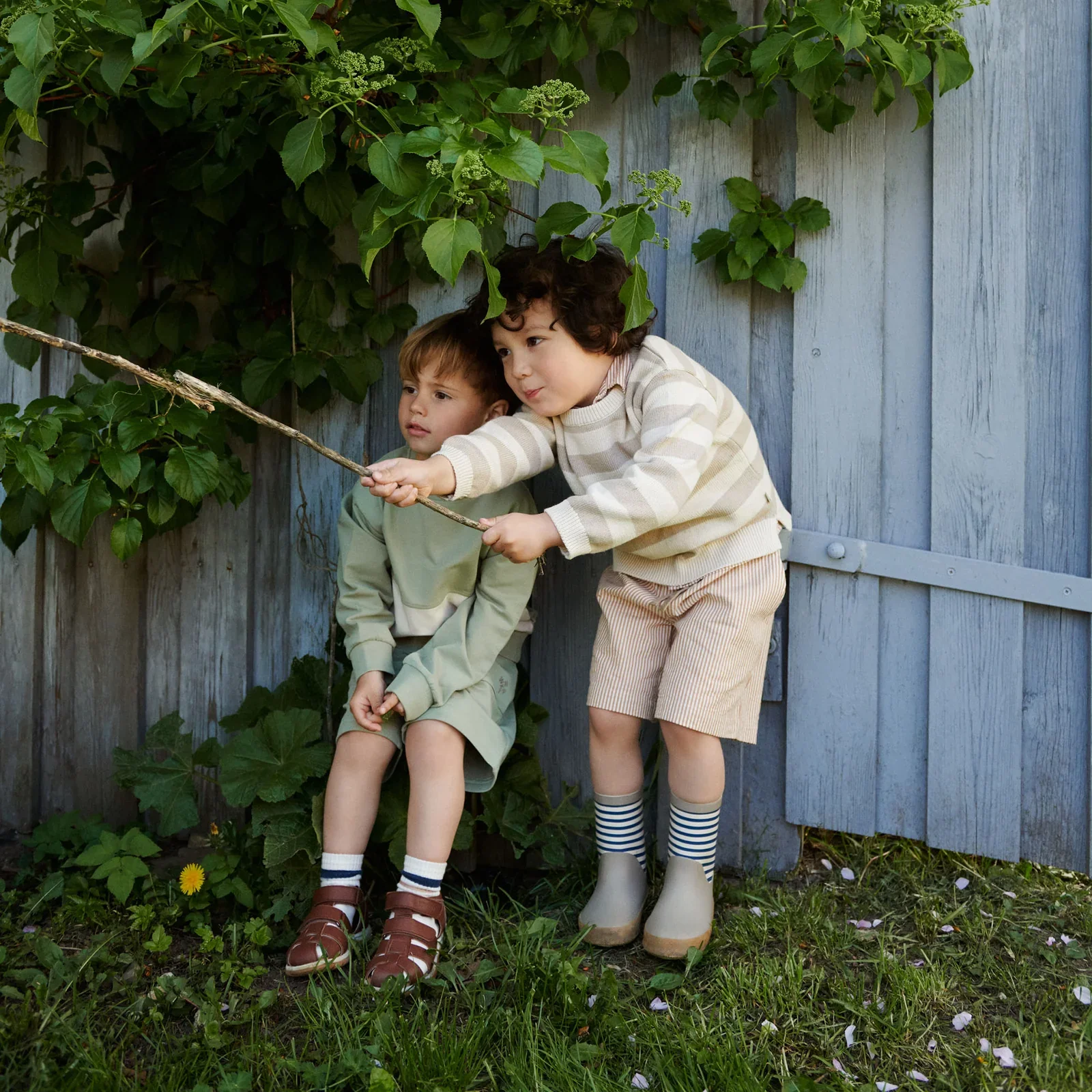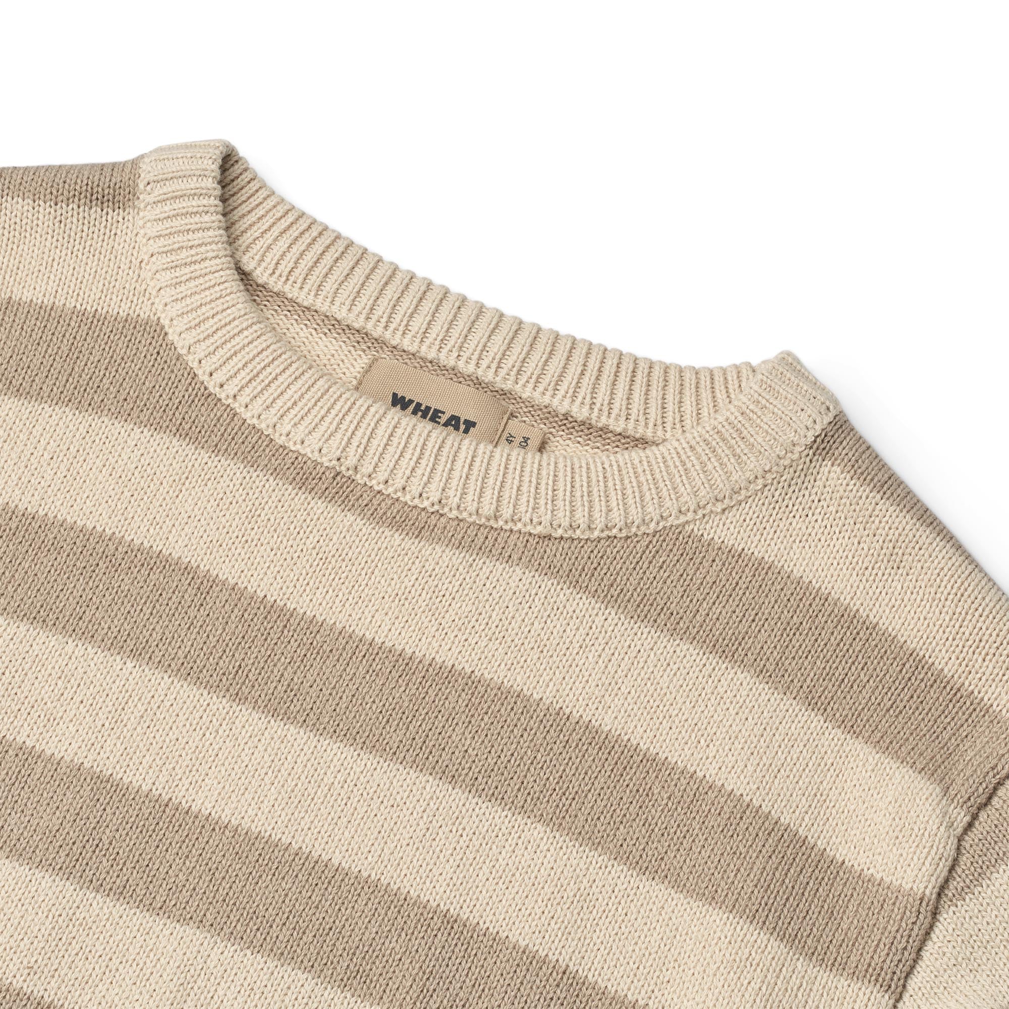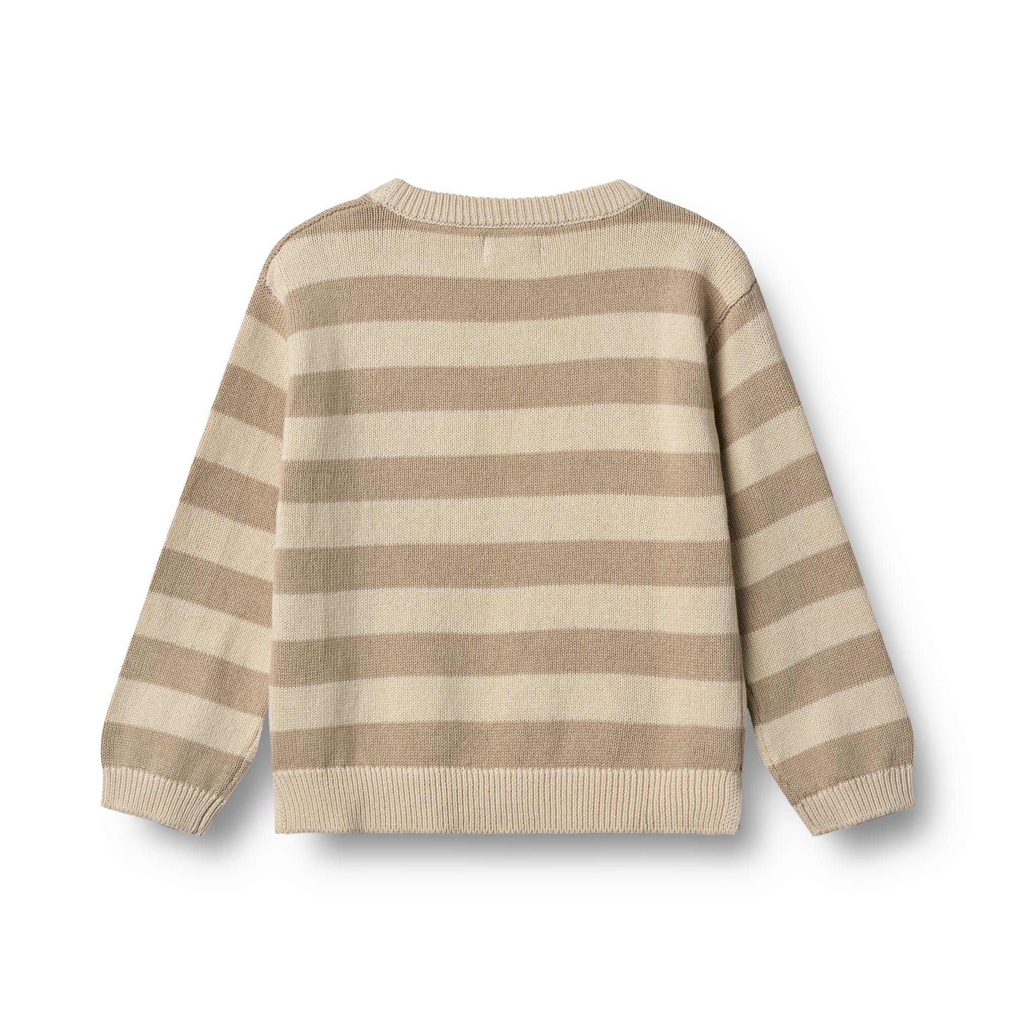 Gebreide trui met lange mouwen en strepen van zacht biologisch katoen voor kinderen. De trui heeft een streep patroon met afwisselend beige en crèmekleurige strepen.