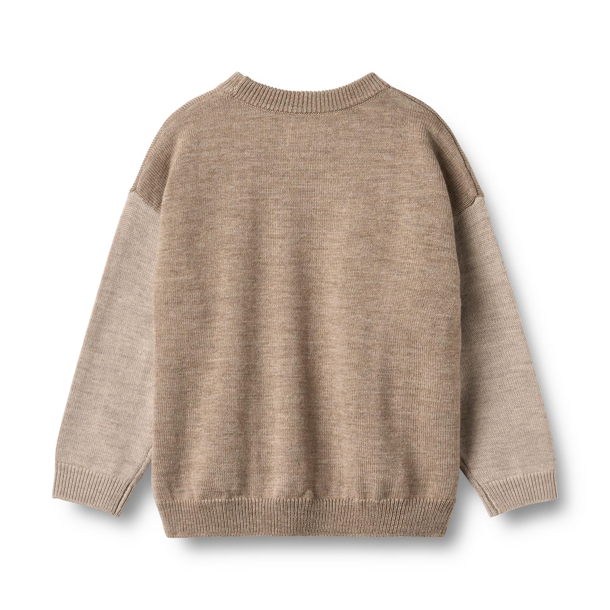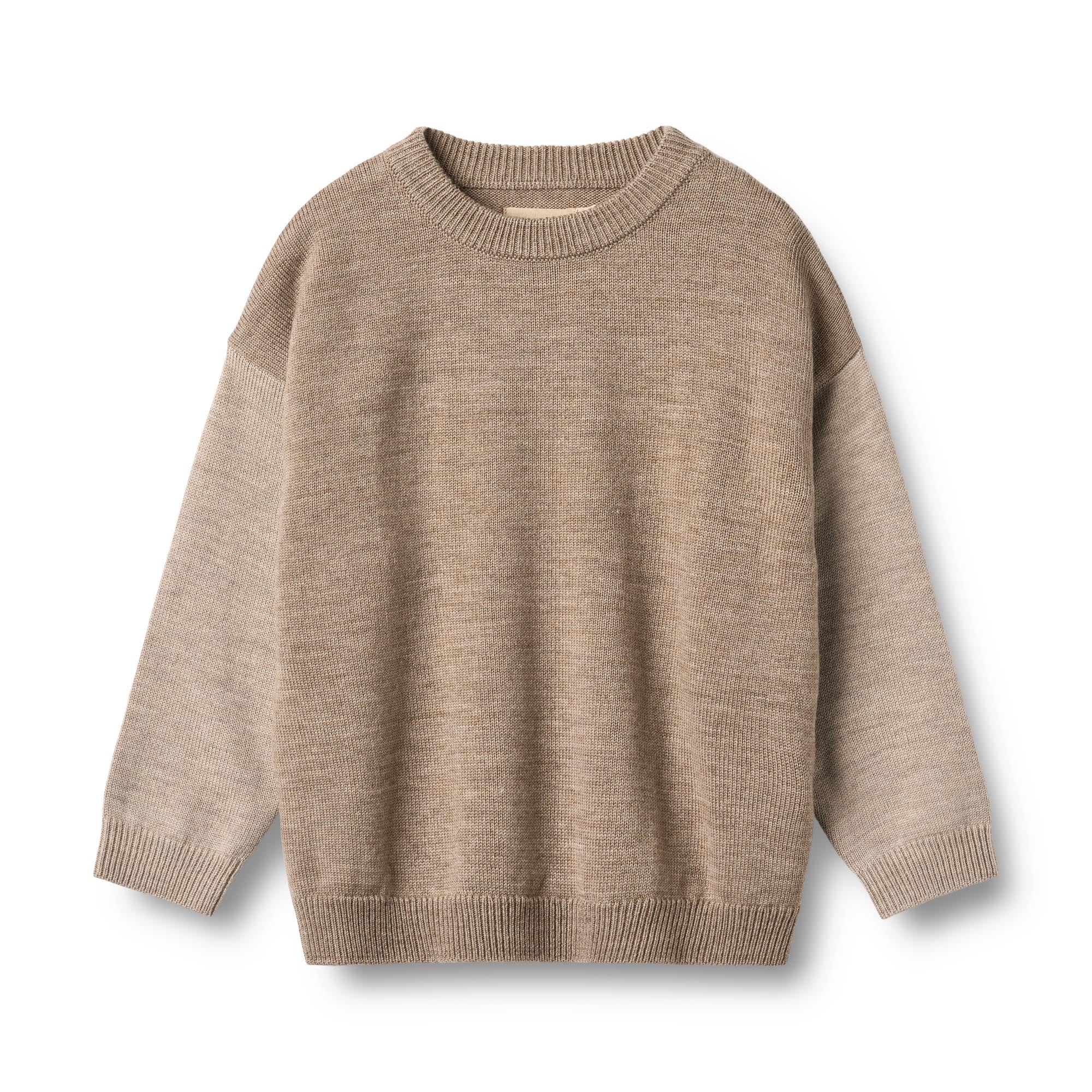 Gebreide trui met lange mouwen van zachte merinowol voor de jongens. Trui Finley van het Deense kinderkleding merk Wheat heeft de kleur grey camel melange, dit zijn beige en taupe tinten.