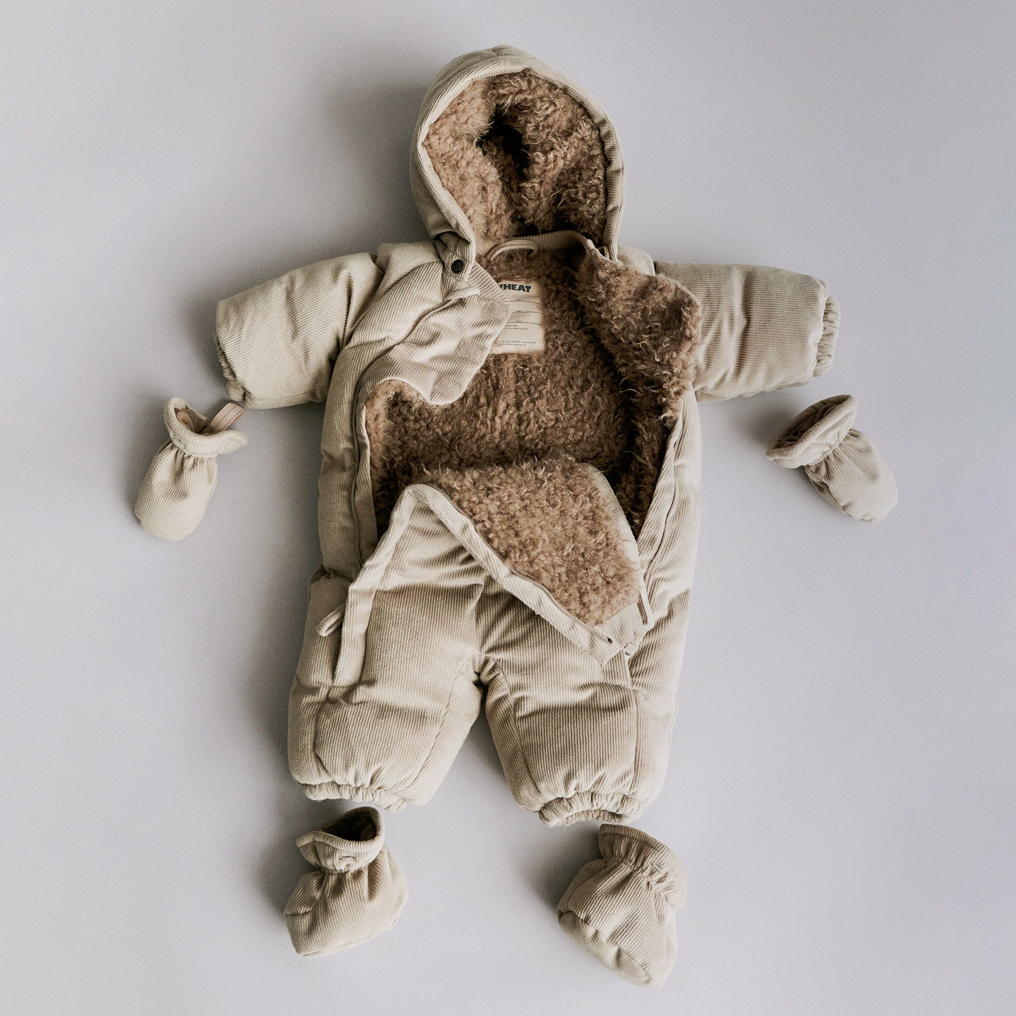 Puffer suit van zacht corduroy voor baby’s. Dit baby skipak van Wheat is in de kleur stone grey, een beige tint met grijze ondertoon.