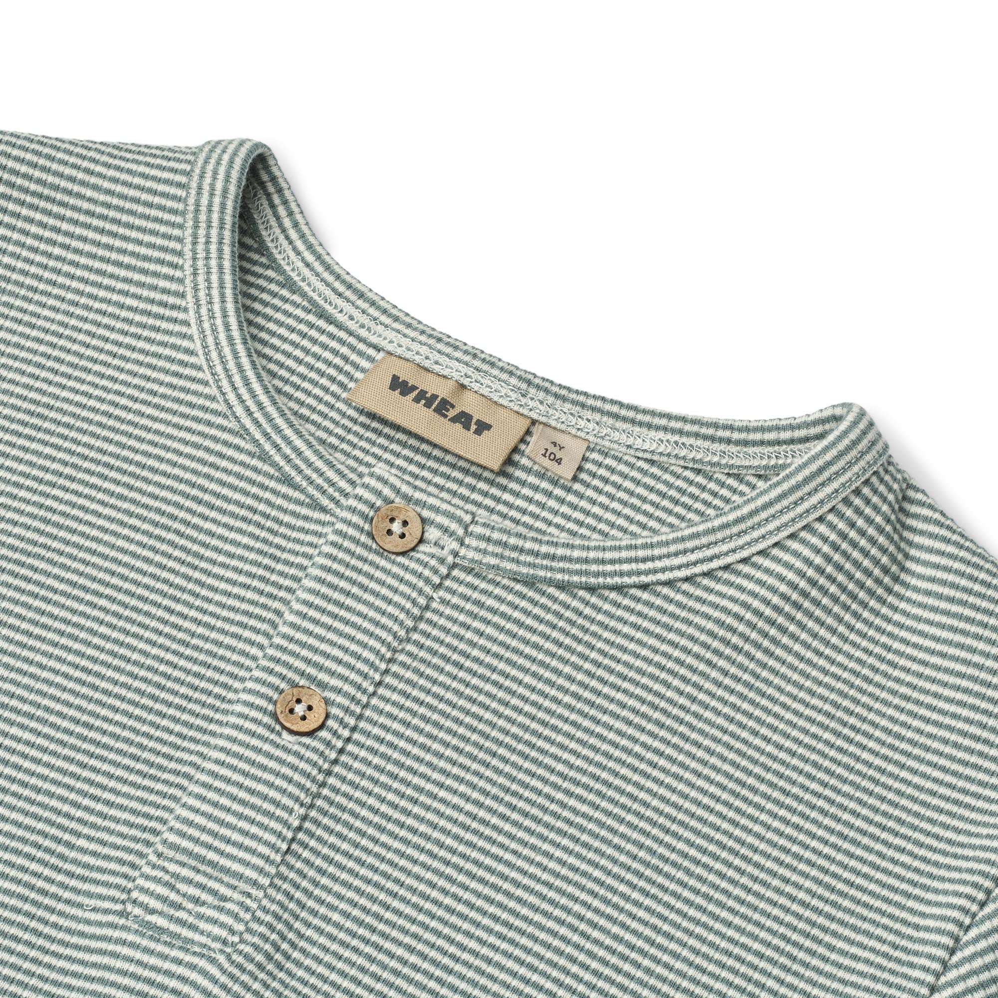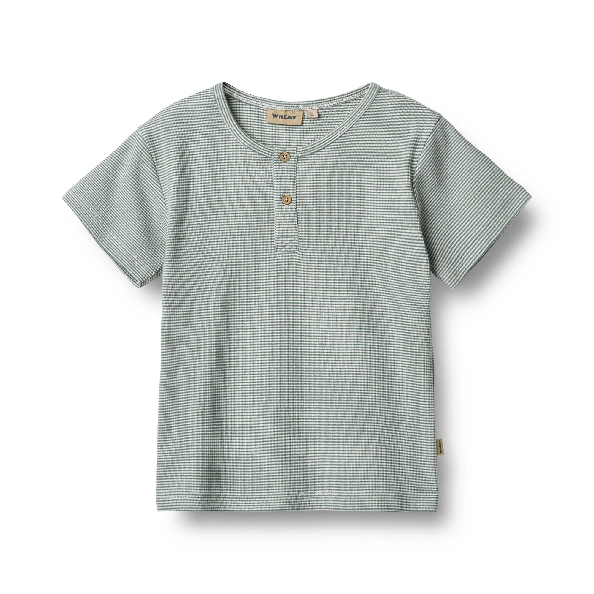 Rib T-shirt met korte mouwen van zacht biologisch katoen voor kinderen. De kleur stormy sea is een donker aqua groene kleur.