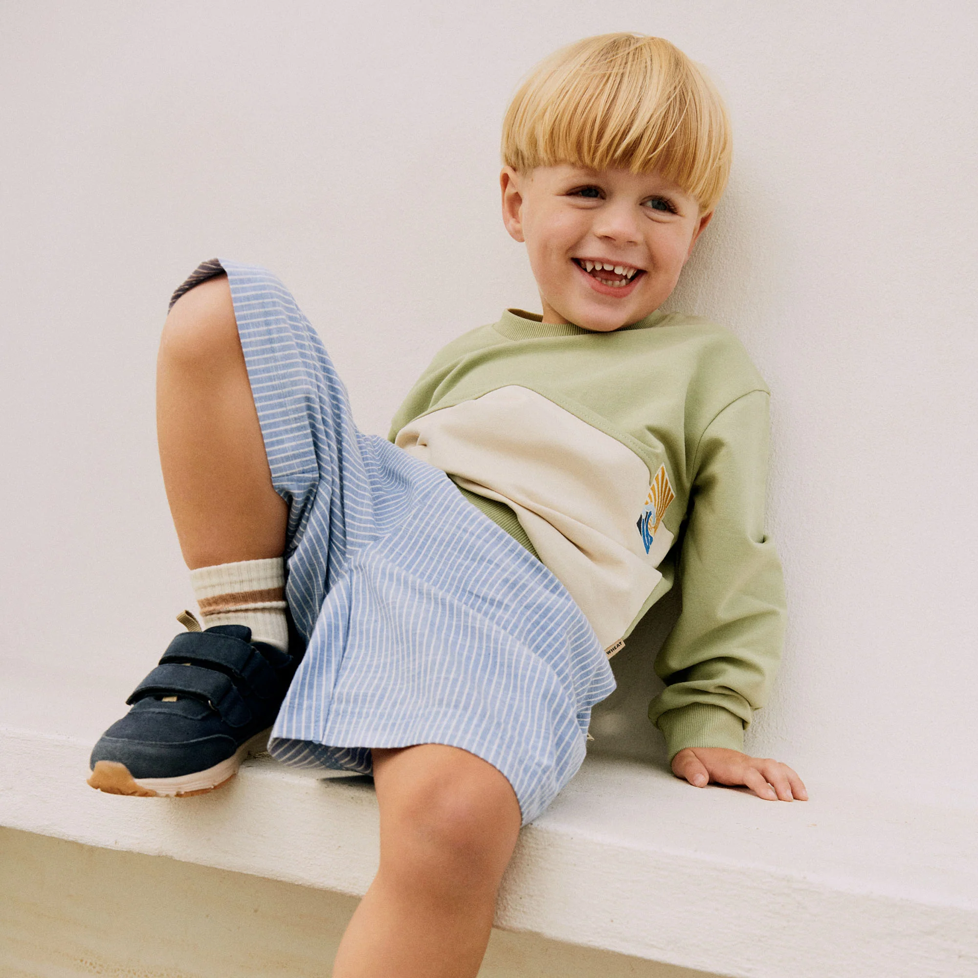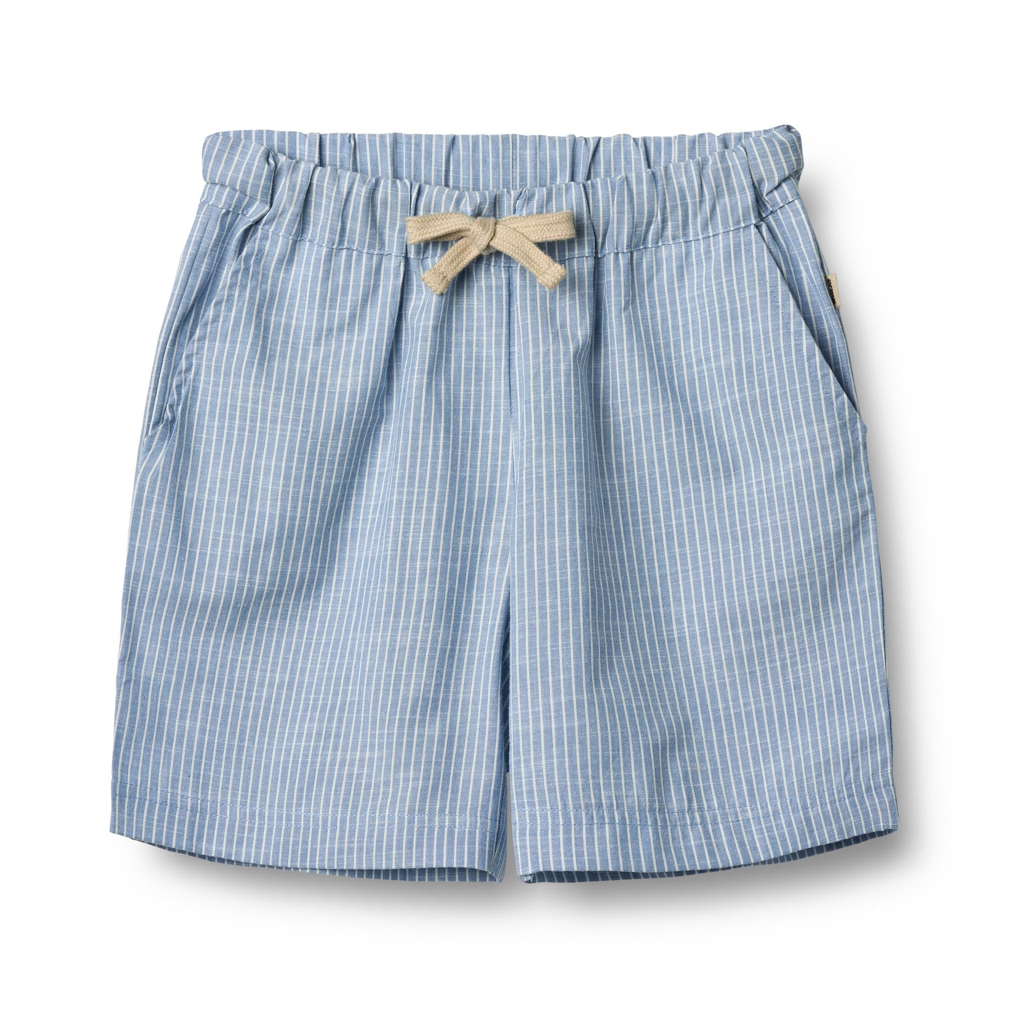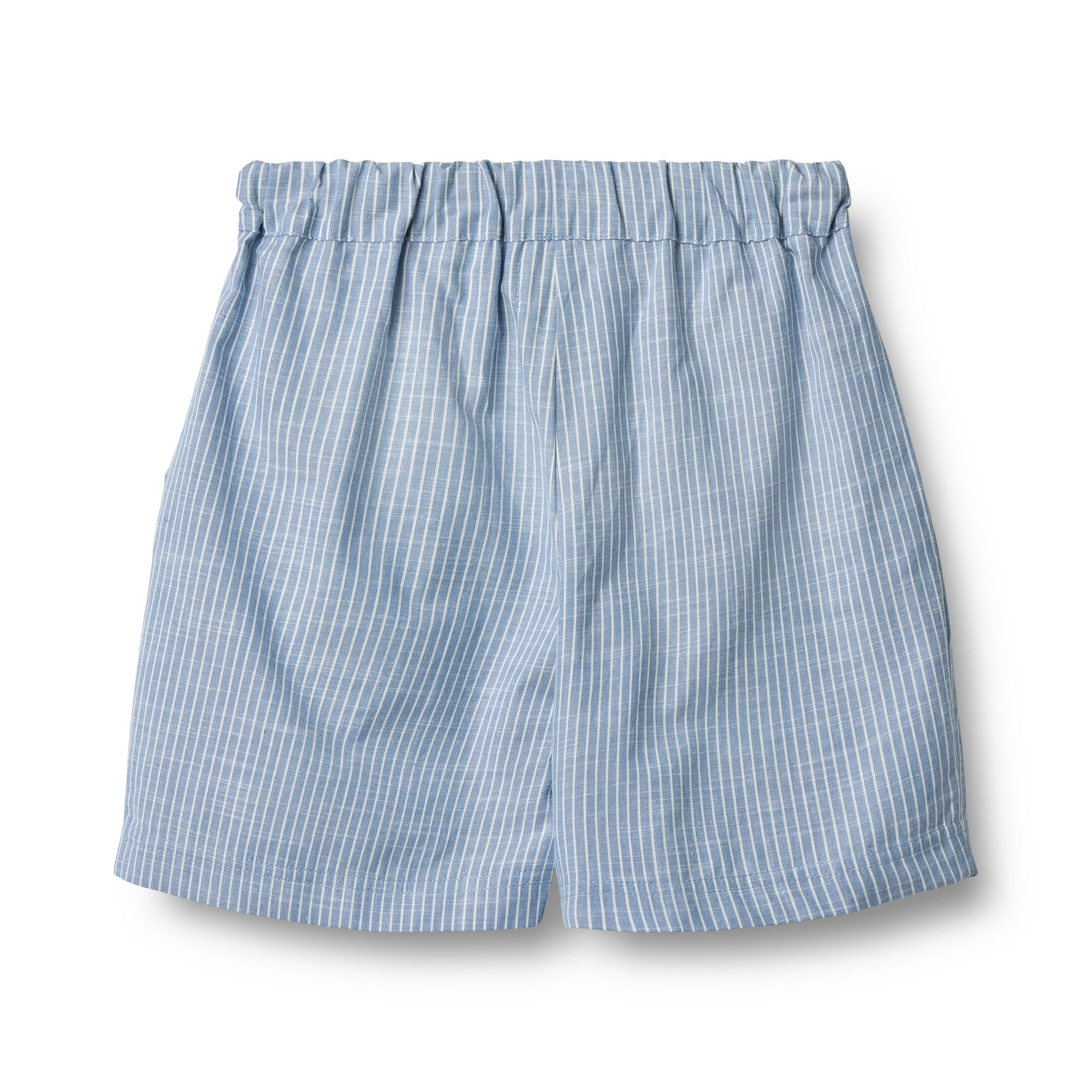 Blauw gestreepte seersucker shorts van het Deense merk Wheat.