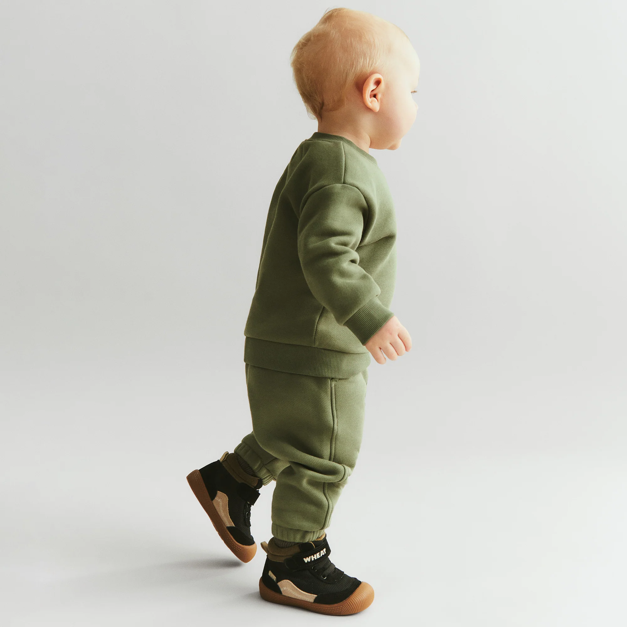 Sweatshirt met lange mouwen voor je baby, gemaakt van zacht biologisch katoen. De kleur dusty green is een midden groene kleur. De kleur is zoals op de productfoto’s (foto met witte achtergrond). De sweater is minder fel van kleur in vergelijk met de foto waar de dreumes de trui draagt.