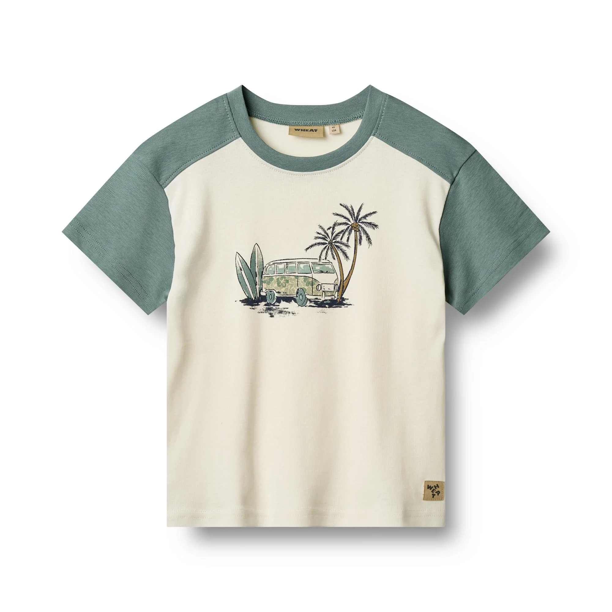 Summer vibes! T-shirt met korte mouwen en zomerse print op de voorkant met een kampeer busje, surfplank en palmbomen. De kleuren zijn ivory white en stormy sea green.