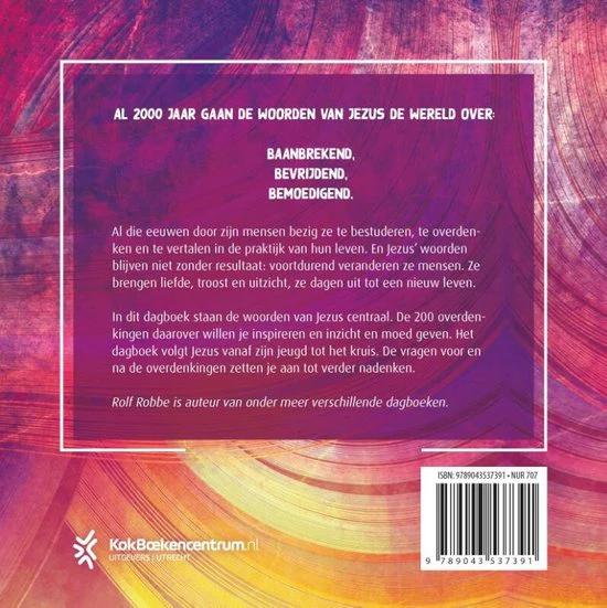 ‘Woorden van Jezus’ is een bijbels dagboek van Rolf Robbe waarin de dingen die Jezus zegt centraal staan. Vroeger sprak God op allerlei manieren tegen onze voorouders, via de profeten. Maar nu Gods nieuwe tijd begonnen is, heeft hij tegen ons gesproken via zijn Zoon, staat er in Hebreeën 1. En deze Zoon Jezus spreekt over genade en vrede. In dit dagboek staan de woorden van Jezus centraal. Alles was Jezus zei, en nog tegen ons zegt in de Bijbel, komt voort uit oneindige liefde voor de mens en de grote wijsheid van God. Het dagboek volgt Jezus vanaf zijn jeugd tot het kruis en overdenkt de woorden die Hij op aarde sprak. De vragen voor en na de overdenkingen zetten aan tot nadenken.
