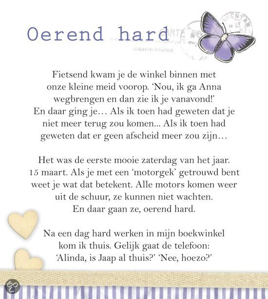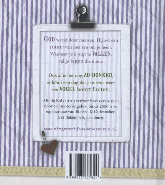 Het is niet zo gek dat je moe bent. In het woord rouwverwerking zit het woord werk. Je lichaam is continue aan het werk. Dit boek is mooi geïllustreerd met mooie bemoedigende teksten: God werkt door mensen. Hij zet een muur van mensen op je heen. Wanneer je dreigt te vallen, val je tegen die muur. Ook al is het nog zo donker, er komt een dag dat je ineens weer een vogel hoort fluiten.