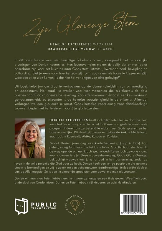 In dit boek lees je over vier krachtige Bijbelse vrouwen, aangevuld met persoonlijke ervaringen van Dorien Keurentjes. Hun levensverhalen maken duidelijk dat er vier topics onmisbaar zijn voor het luisteren naar Gods stem: intimiteit, kwetsbaarheid, bevrijding en volharding. Stel je eens voor hoe het zou zijn om Gods stem als focus te kiezen én Zijn woorden uit te zien komen. Is dat niet het verlangen van elke gelovige? Dit boek helpt jou om God te vertrouwen op de dunne scheidslijn van ontmoediging en daadkracht. Het maakt je wakker voor vier momenten die als sleutels de deur openen naar Gods glorieuze bestemming. Zoals de vrouwen in dit boek een keus maken in gehoorzaamheid, zo bijzonder is de hemelse voorzienigheid in de uitkomst. Allemaal verlangen we een glorieuze uitkomst. Gods hemelse voorziening voor daadkrachtige vrouwen begint met het luisteren naar Zijn glorieuze stem. DORIEN KEURENTJES heeft zich altijd laten leiden door de stem van God. Ze was erg creatief in het faciliteren van grote internationale groepen kinderen om ze bekend te maken met Gods spreken en het bovennatuurlijke. Dit deed zij binnen en buiten de kerk in Nederland, maar ook in Roemenië, Afrika, Kosovo en Pakistan. Nadat Dorien jarenlang een kinderbediening (STAP-IN-KIDS) had geleid, vroeg God haar om het los te laten. God liet haar zien hoe Hij de weg opende om een krachtige, invloedrijke en toch gewone vrouw voor vrouwen te zijn. Deze vrouwenbeweging, Gods Glory Garage, bekrachtigt vrouwen van jong tot oud in hun bestemming, zodat ze leven in de volle potentie die God voor ze heeft. Dorien heeft een vurige passie om die gewone vrouw te bemoedigen en vrij te zetten tot een buitengewoon daadkrachtige, invloedrijke dochter van de Allerhoogste. Ze is een inspirerende spreekster voor zowel mannen als vrouwen. Dorien en haar man Peter hebben een huis waar ze jongeren een thuis geven: WeesThuis.com, onderdeel van Credohuizen. Dorien en Peter hebben vijf kinderen en acht kleinkinderen.