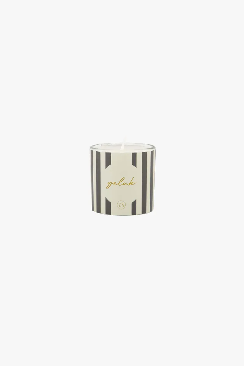 Voel de heerlijke vibe van een frisse middagbries, zelfs op een sombere dag. Hoe? Door deze mega leuke geurkaars aan te steken. Deze sfeermaker is zandkleurig met antracietkleurige strepen en de tekst: geluk. De kaars heeft een doorsnede van 4,7 cm en is 4,4 cm hoog. Match deze geurkaars met andere woonaccessoires uit de collectie.