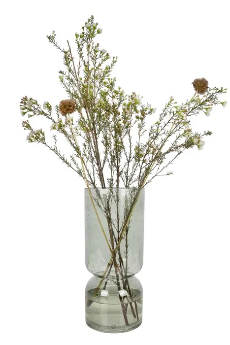 Deze glazen vaas van Zusss is erg modern. Hij staat al snel goed in ieder interieur. De vaas is van glas, dus transparant. Er zit een olijfgroene tint in het glaswerk verwerkt. In het glas zijn kleine bubbeltjes verwerkt voor een speels effect. De vorm van de vaas is te vergelijken met een zandloper. Heel uniek! De vaas kent een hoogte van 30cm. De diameter is 13cm. Leuk om extra hoge bloemen in de vaas te plaatsen! Bijvoorbeeld zonnebloemen. Onderaan de vaas staat het Zusss logo afgebeeld. Stijl de vaas af met leuke woonaccessoires.