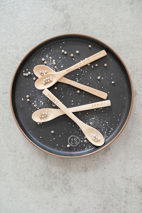 Houten lepeltje met in de steel een leuke tekst gegraveerd. De tekst op dit lepeltje is Vier elke dag. Combineer hem met het leukste Zusss servies, voor een stoere combinatie. Of gebruik hem gewoon in de suiker, koffie of als klein lepeltje om nootjes mee op je hand te scheppen.