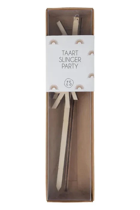 Zei er daar iemand “party”? Bij een feestje hoort taart! En die taart vrolijk je helemaal op met deze leuke taartslinger. Aan de slinger hangen houten letters welke samen het woord “party” vormen. De uiteinden van de slinger zitten vast aan houten stokjes welke je gemakkelijk in de taart prikt. De slinger is 18 centimeter breed. Neem eens een kijkje in de categorie koken & tafelen en bekijk hoe je jouw taart nóg mooier presenteert, op een mooi bord of plateau bijvoorbeeld!