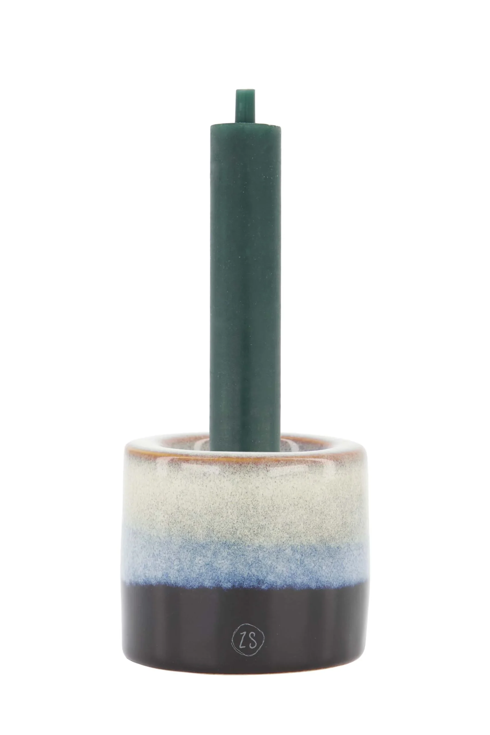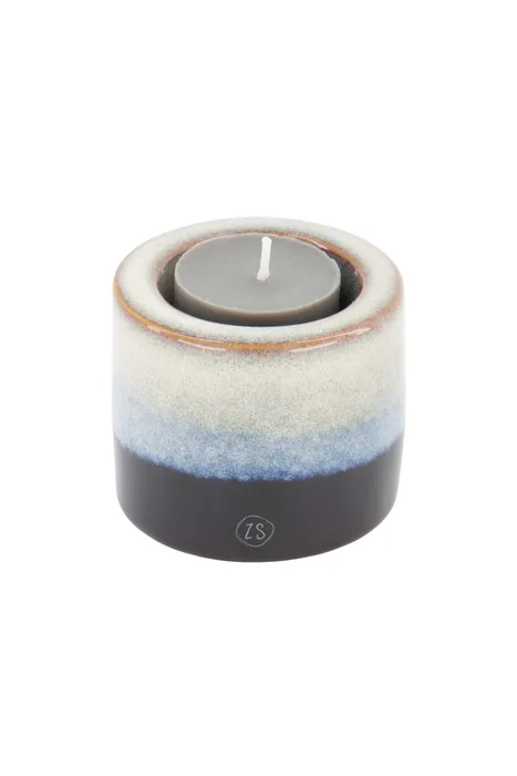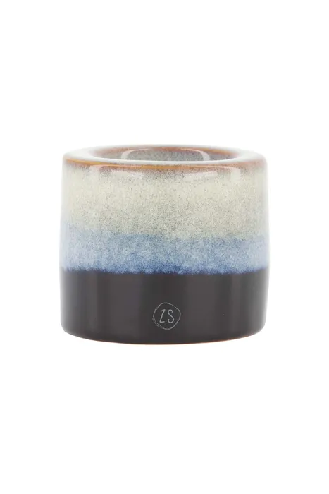 Deze kandelaar van Zusss heeft een stoere look door de verschillende kleuren welke in elkaar overlopen in het glazuur. Dit wordt reactive glaze genoemd. De basis van de kandelaar is gemaakt van keramiek en deze heeft de vorm van een cilinder. De kleuren welke gebruikt zijn voor de kandelaar zijn zwart, zand en een blauwtint. Het Zusss logo is zichtbaar op het zwarte gedeelte. Door het glazuur glanst de kandelaar mooi! Dit artikel is met de hand gemaakt, elk exemplaar is dus uniek en kan qua kleur afwijken van de foto. In deze kandelaar past een rustiek Zusss kaarsje of een waxinelichtje.