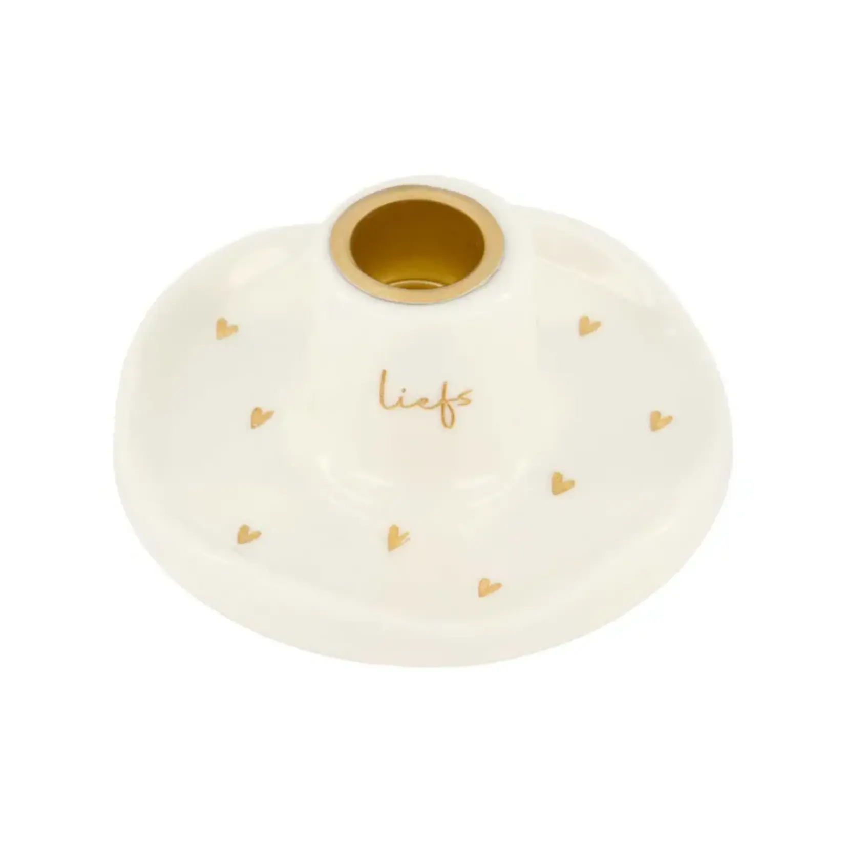Keramieken kandelaar met gouden hartjes en de tekst “liefs”, perfect voor rustieke en geribbelde kaarsen.