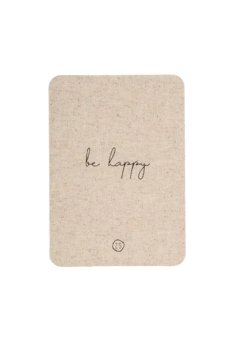 Dit kaartje zal zeker opvallen tussen alle andere kaartjes in. Het is namelijk een linnen kaart! Hierdoor heeft de kaart een naturel kleur. Op de voorkant staat in zwarte sierlijke letters de tekst: be happy. Het kaartje kan dus verstuurd worden bij meerdere gelegenheden. Aan de onderkant staat het Zusss logo afgebeeld. De achterkant van de kaart is van wit papier en is blanco. Enkel het Zusss logo staat onderaan afgebeeld. Je kunt de kaart versturen in de bijbehorende envelop.