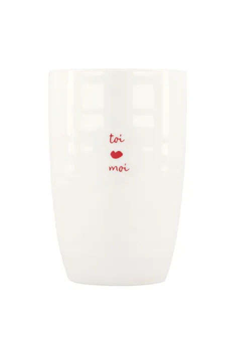 Een warmer welkom kunnen je gasten niet krijgen. Vul deze fijne Zusss mok met warme thee of koffie en maak je klaar om gezellig bij te kletsen in het zonnetje! Op deze witte mok staat in rode letters: moi et toi. De mok heeft een diameter van 8,5cm en is 13cm hoog. Je combineert deze ook leuk met de andere aardewerken items van Zusss.