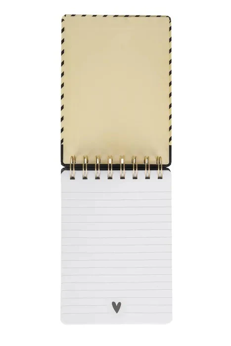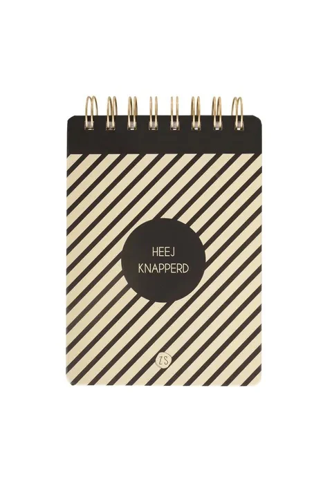 Heej knapperd! Schrijf al jouw goede ideeën voortaan op in dit leuke notitieboekje. Op de kaft staat een strepenprint afgebeeld in de kleuren zwart en lichtgeel. In een zwarte cirkel staat de tekst “heej knapperd”, en onderaan staat het Zusss logo afgebeeld. Door de ringband blader je gemakkelijk door dit boekje heen. Het notitieboekje is voorzien van witte pagina’s met lijntjes. Het hartje onderaan elke bladzijde fleurt de boel nog eens extra op. Aan welke knapperd ga jij dit notitieboekje cadeau geven? Of hou je hem lekker voor jezelf?