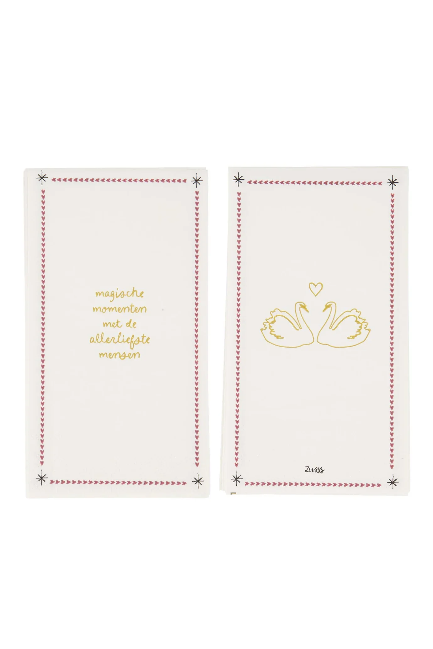 De Zusss servetten magische momenten geven jij en je dierbaren een speciale uitstraling aan het diner. Deze servetten magische momenten zijn afgestemd op gezellige tafelmomenten, met een liefdevol ontwerp in wit met donkerrood. Hun formaat is rechthoekig en ze zijn perfect om de tafel net dat beetje extra warmte te geven. Combineer ze gemakkelijk met andere zusss accessoires om jouw huisstijl compleet te maken.