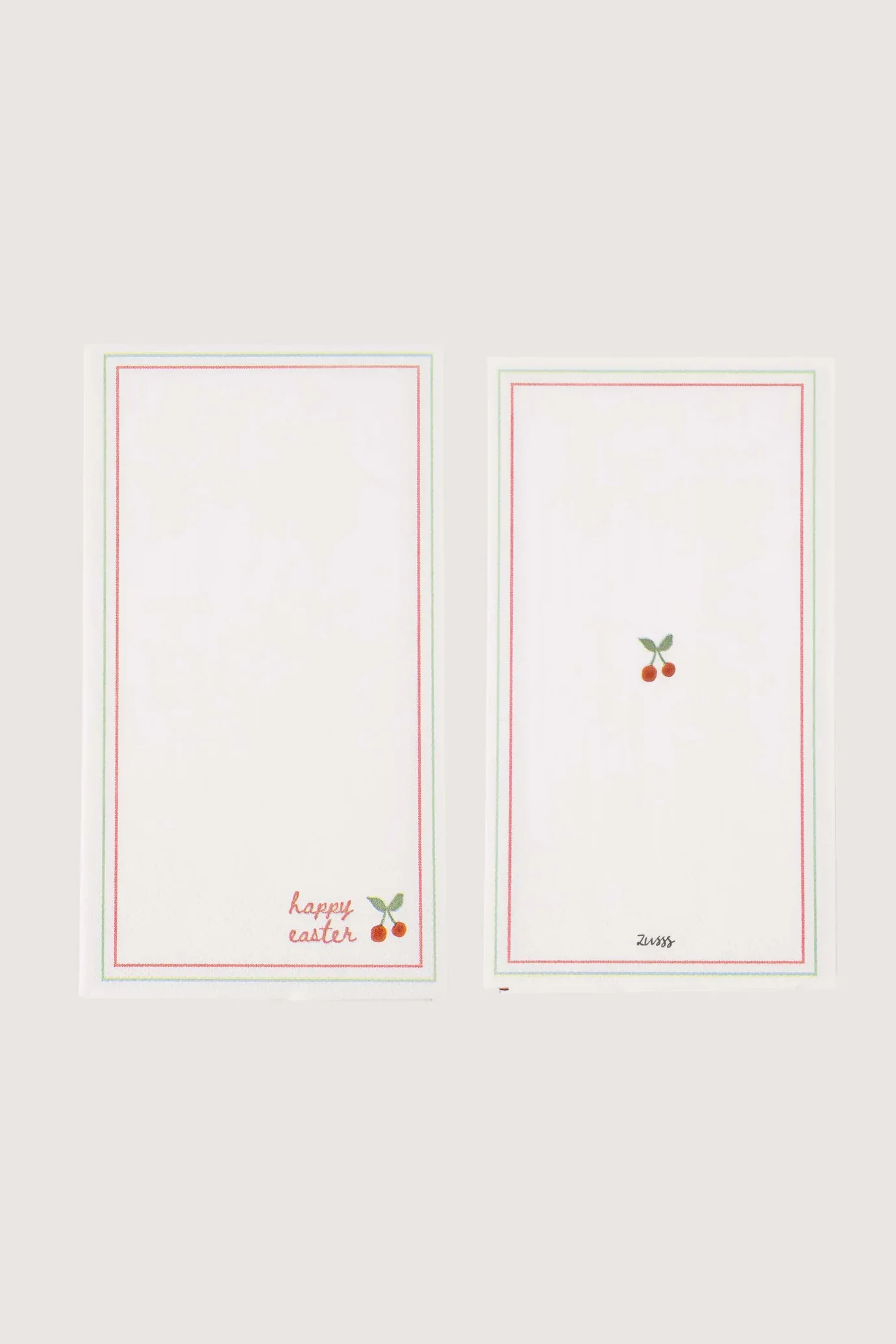 Deze Zusss servetten voor Pasen in off white zijn perfect om je lentetafel feestelijk te maken. De servetten zijn van papier gemaakt, met een afmeting van 25×38 cm en een subtiele groene en goudkleurige rand. Onderaan vind je het lieve “happy easter” tekstje met een vrolijk kersje, dat zorgt voor een vrolijke sfeer tijdens het paasontbijt.