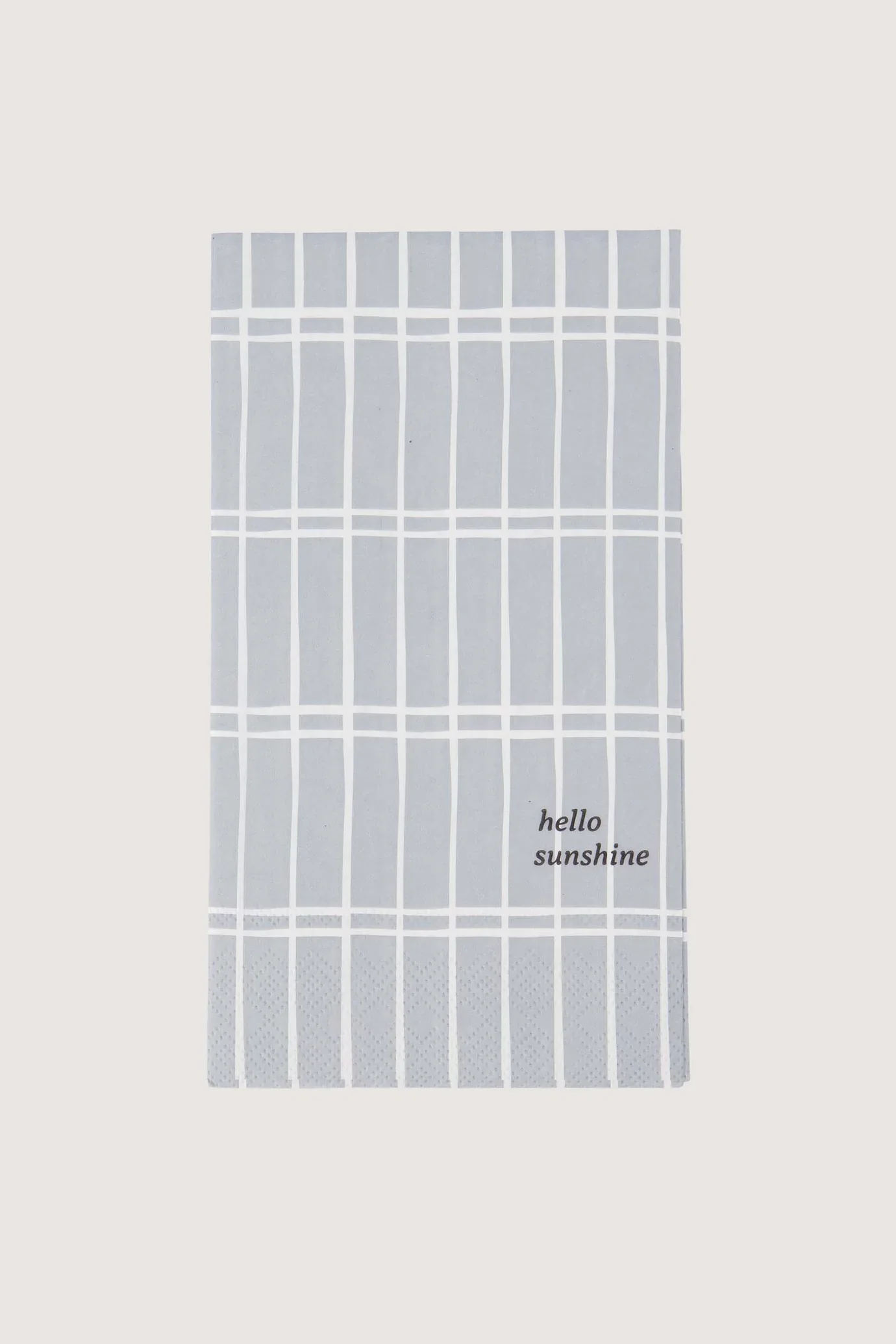 De Zusss servetten met ruit zijn dé eyecatcher op jouw tafel. Deze servetten zijn gemaakt van stevig papier in een grijsblauwe kleur met een subtiele goudkleurige ‘hello sunshine’ tekst. Met hun rechthoekige vorm en het speelse ruitpatroon geven ze jouw tafeldecoratie een stijlvolle en vrolijke touch. De afmetingen van deze servetten passen perfect bij elke gelegenheid.