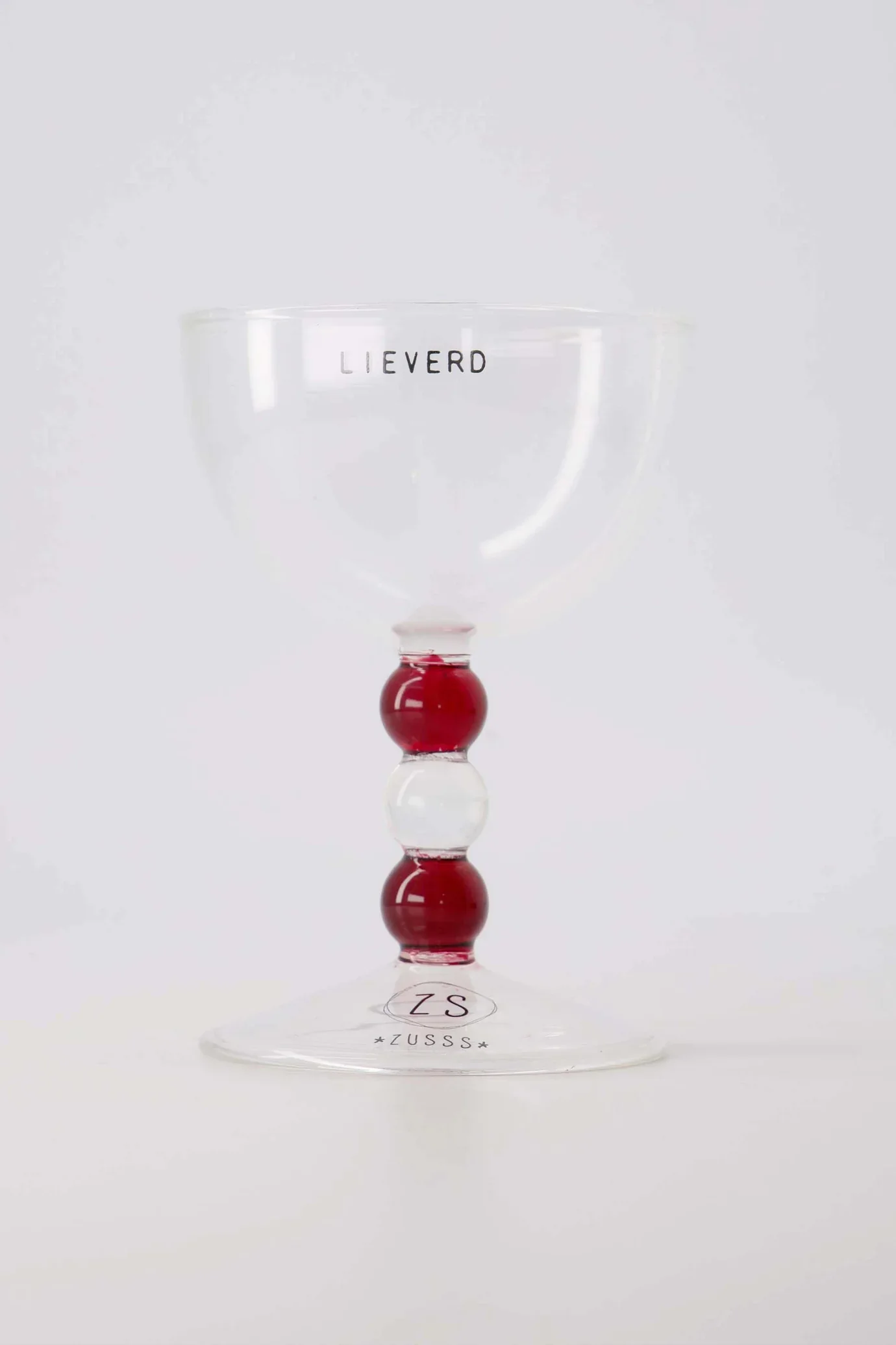Het Zusss wijnglas lieverd is een bijzonder transparant glas dat direct in het oog springt. Met de speelse rode en heldere bolletjes in de steel krijgt dit wijnglas een unieke uitstraling. Het duidelijke ‘LIEVERD’ op de bolle kelk maakt het helemaal af. Perfect voor een gezellig moment, dit wijnglas lieverd brengt warmte en eigenheid aan je tafel. De zachte kleuren en fijne afwerking passen naadloos in elk servies, waardoor genieten extra leuk wordt.